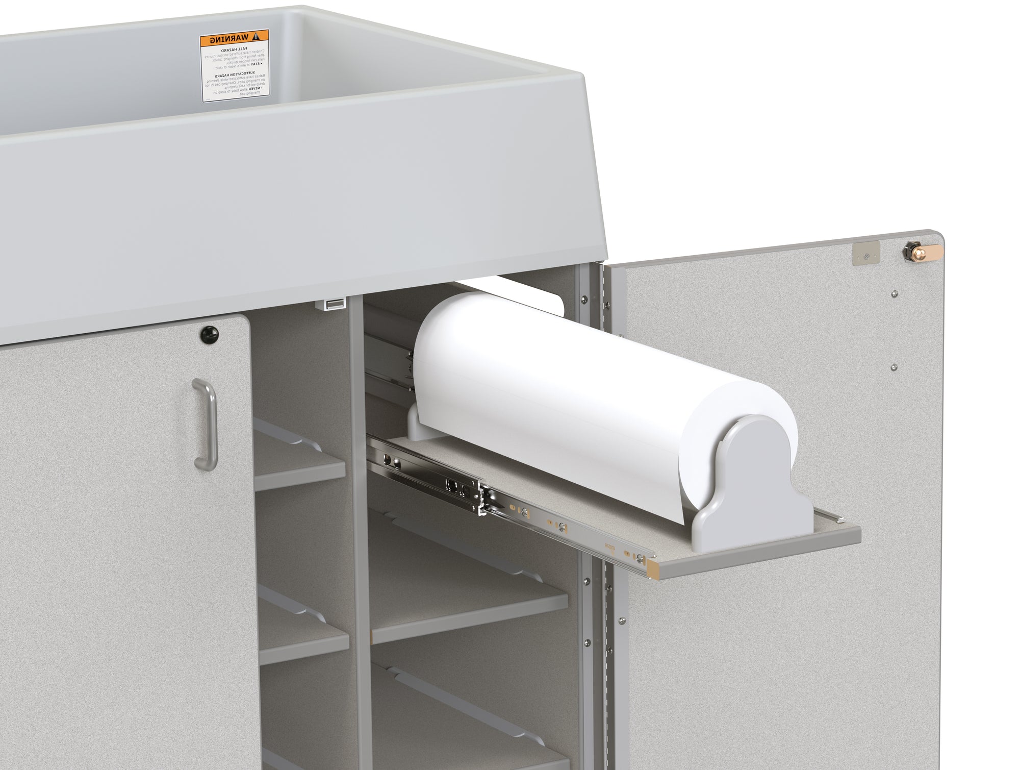Convenient wall mounted storage for diapering necessities. Install above changing table for a complete changing station. KYDZTuff¨ finish and KYDZSafe¨ edges. Mounting hardware included. 48" wide x 12" deep x 25" high.