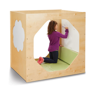 Create a retreat for students to separate themselves from the hustle and bustle of the classroom. Platinum winner of the Spaces4Learning 2022 New Product Awards, the Dream Cube is perfect for reading, studying, and relaxing. Double-sided Write-n-Wipe surfaces on the sides provide a space for students to jot down ideas, learning concepts, and work out problems. Large cutouts in the sides and the open top give teacher visibility while still creating a private area for students. No cushions are included so you can add your own! Angled back rests inside create an ergonomic seat. Side openings are 37” in diameter. Cloud Write-n-Wipe surfaces are 24” high x 28.5” wide. Inside Write-n-Wipe panels are 29.5” high x 33” wide.