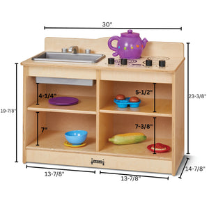 The popular sink and stove combined into one compact kitchen at a toddler's height. Features like the four "burner" stove and wooden turnable controls make for realistic play. Counter is 20" high.