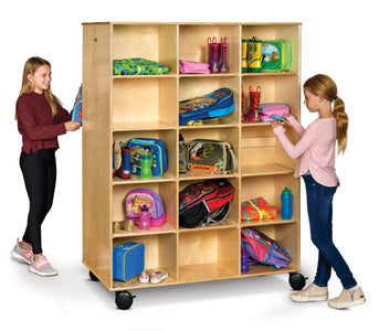 Great for School Age programs or daycare centers. Both sides are identical, each shelving fifteen spacious cubbie holes (15" wide x 13" deep x 11" high). Extra heavy-duty locking casters. 48" wide x 27" deep x 65" high.