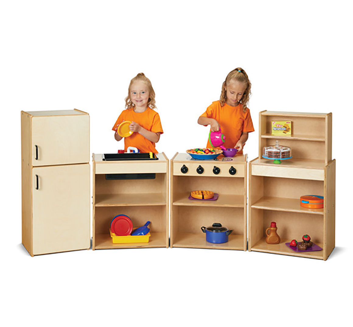 Let your children create their own recipes for imaginative play with this four-piece kitchen set that includes a refrigerator, sink, stove and cupboard. Realistic features like turn controls and “burners” make this budget kitchen set the perfect addition to any dramatic play area.