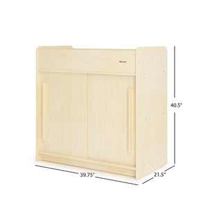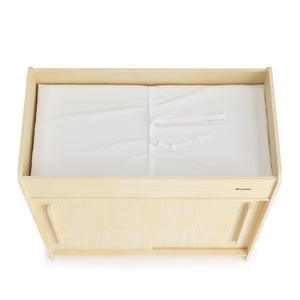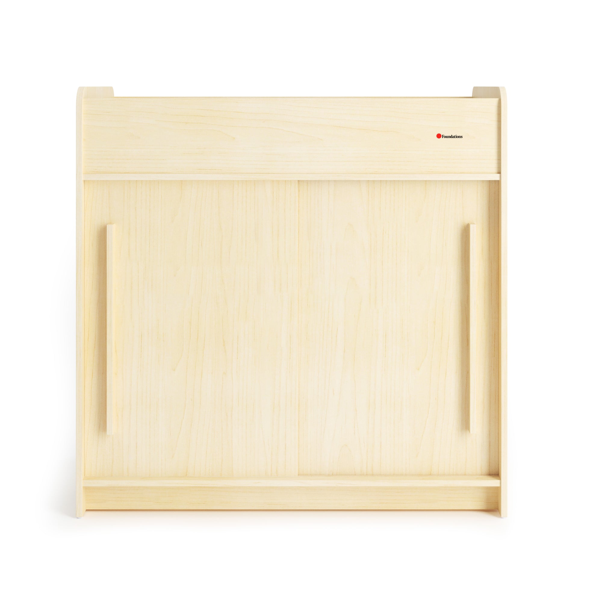 The SafeGlide changing table features a sliding door for easy access to essentials on its two built-in shelves. It's intuitively designed with a recessed back to prevent tipping, and has a 7" deep changing well. Ultra-durable laminate construction resists stains and warping, and is easy to clean. SafeGlide's clean lines and natural finish are designed to match all Foundations cribs and the new Wall-Mounted Diaper Organizer
