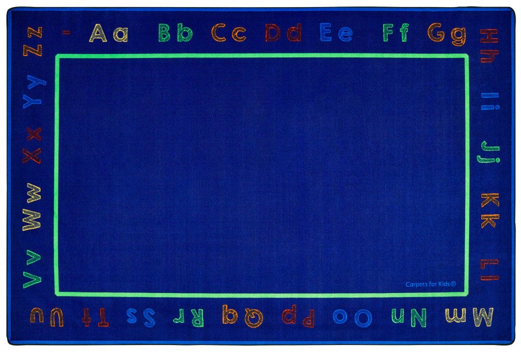 Chalkboard design to coordinate with your chic décor, this premium rug is ideal for classrooms, care centers, and playrooms. Blue background with colorful chalk looking alphabet border.