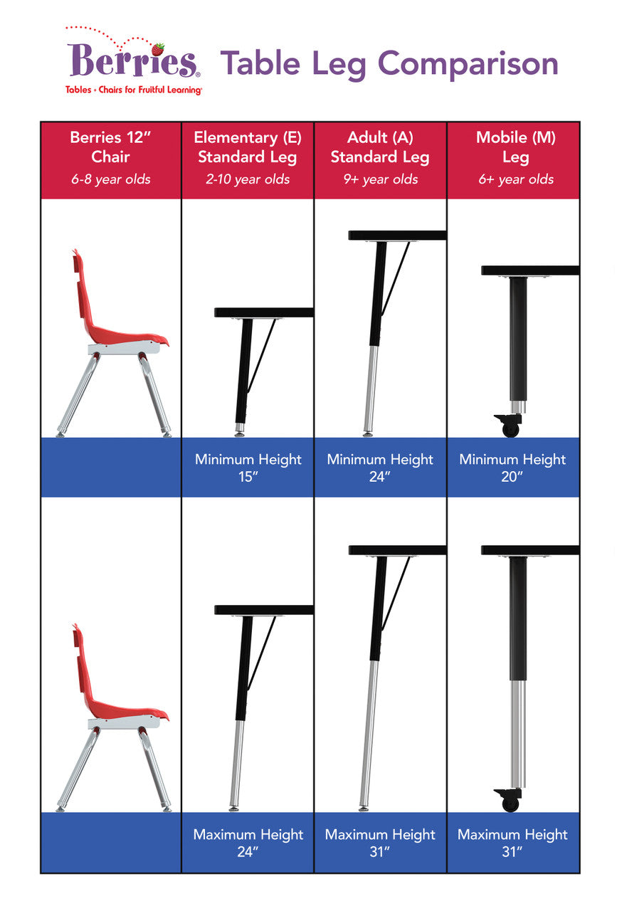 Thermo-fused edgebanding means no place for germs to hide and is stronger than t-molding. Laminate tabletops are 1-1/8" thick. Quick mount legs, minimal assembly. Legs adjust in one-inch increments from 15" - 24" for toddlers up through preschoolers.