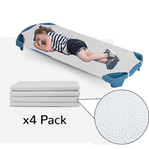 The Angels Rest White Cot Sheet - Standard - Set of 4 provides a comfortable and secure nap time solution for toddler cots and cots for sleeping. These durable daycare cot sheets are designed with elastic straps on all four corners to ensure a snug fit on sleeping cots for kids. Machine washable and easy to maintain, these toddler cot sheets are a practical choice for creating a clean and comfortable rest environment. Perfectly sized for standard daycare cots, this set of 4 ensures you’re always prepared for nap time.