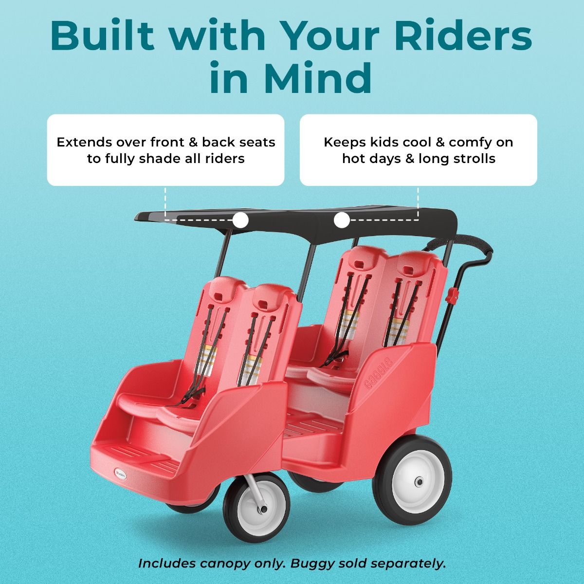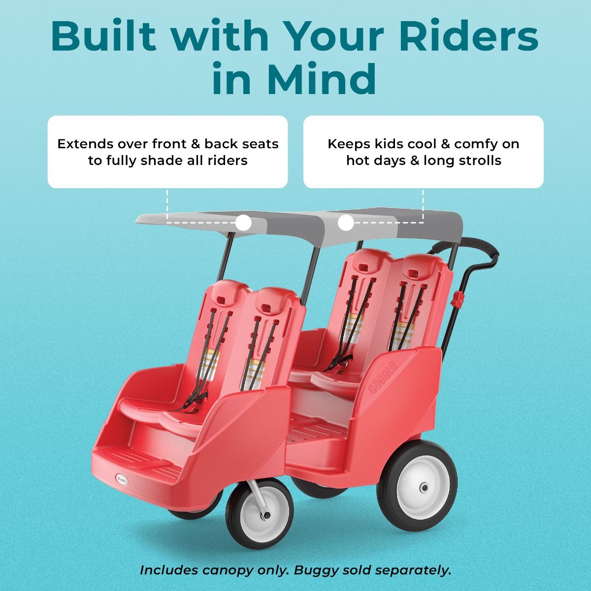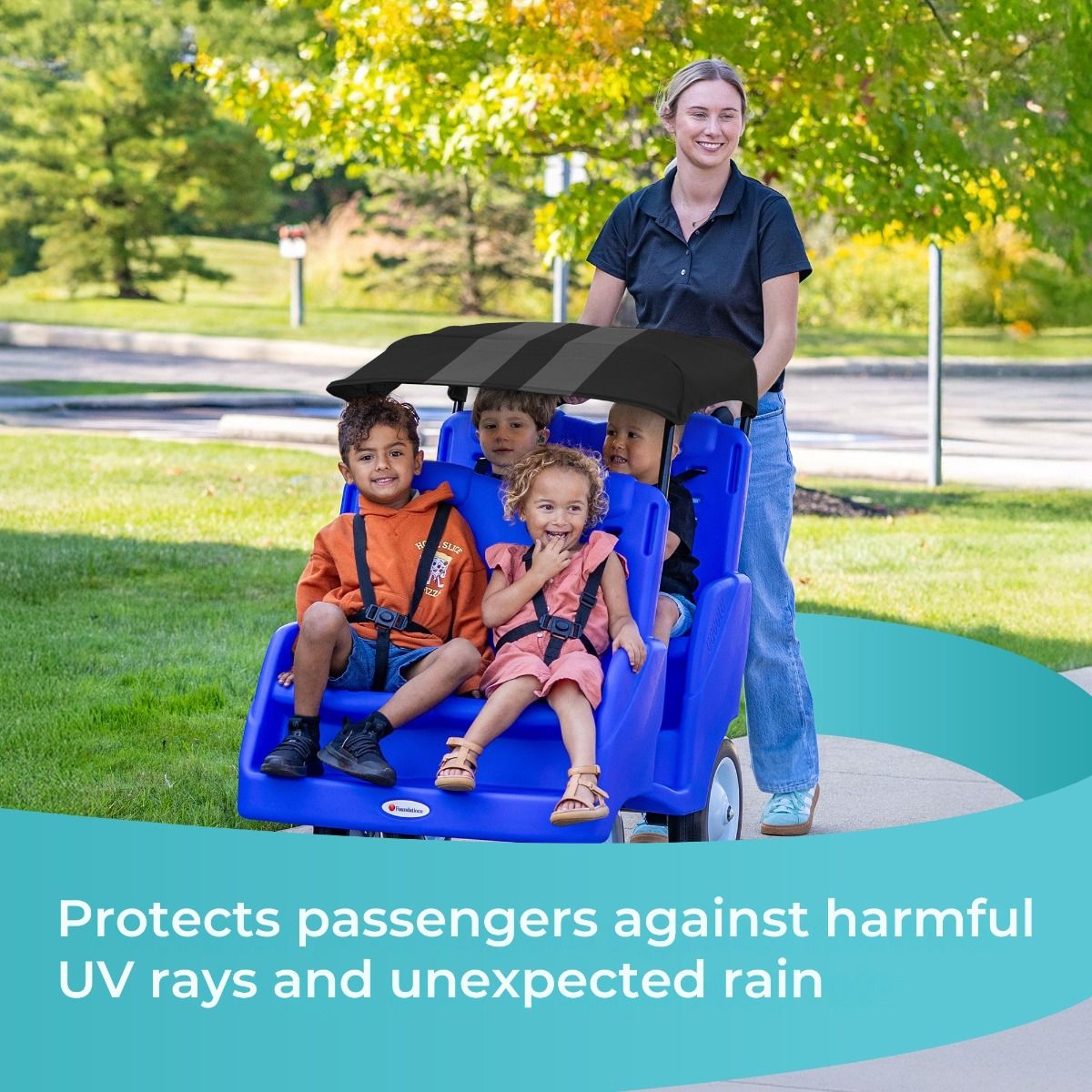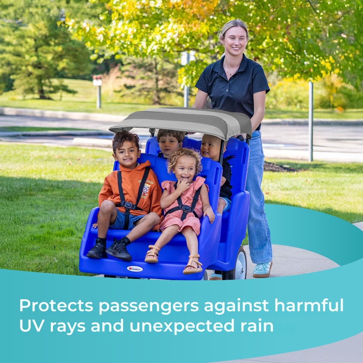 Gaggle® Parade™ canopy roof protects passengers from UV rays and rainy conditions during rides.