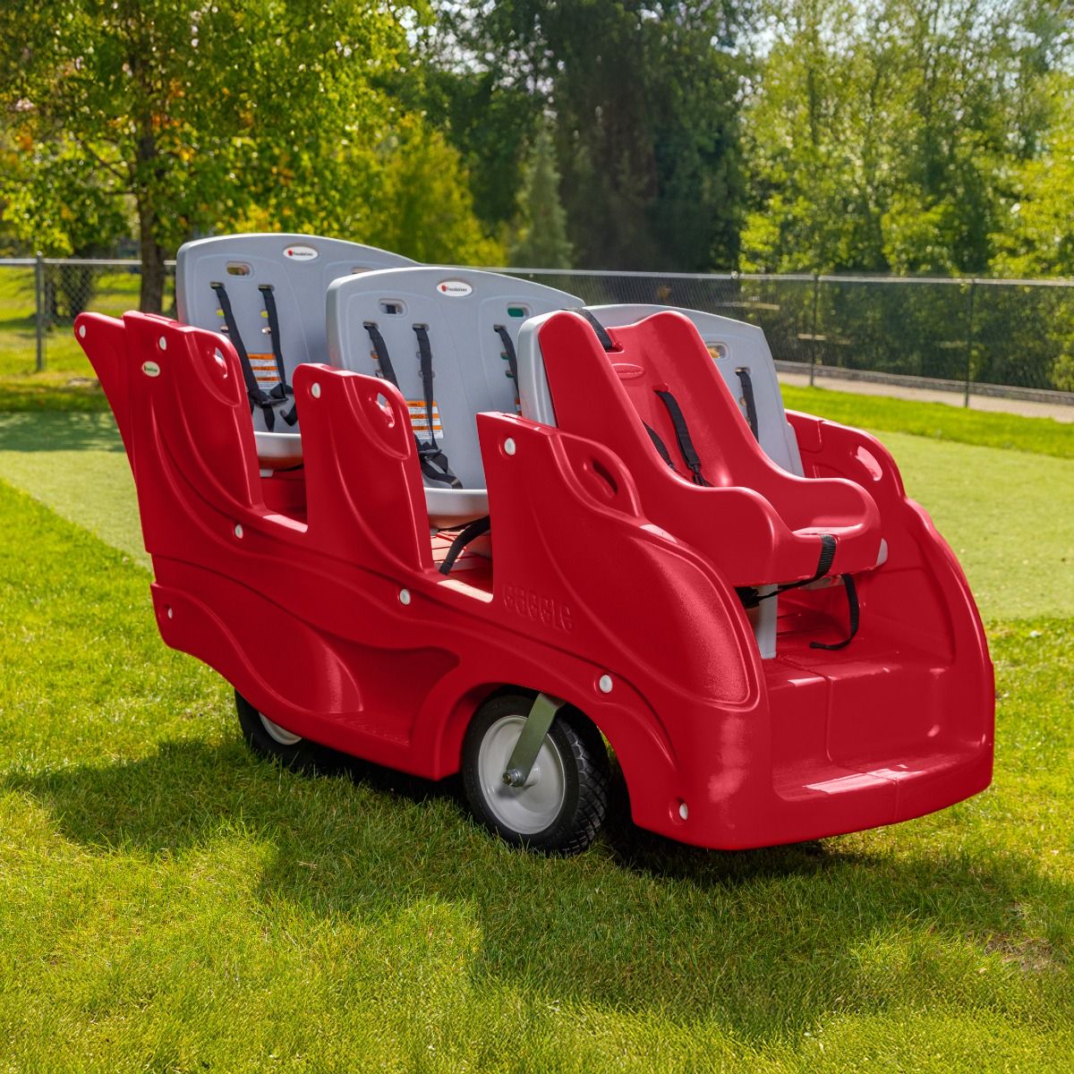 The Gaggle® Parade 6 Buggy is designed with superior safety convenience, with features ideal for daycare and high use commercial environments. The multi-passenger stroller buggy is equipped with 6 comfortable seats, each with a 5-point harness to take children out for rides, safely. The easy-to-steer design with a padded push-handle reduces strain on caregivers. The Soft-Stop Brake allows for a quick stop when the handle is released. Children will love climbing aboard the uniquely styled Gaggle® Parade 6 multi-child buggy.