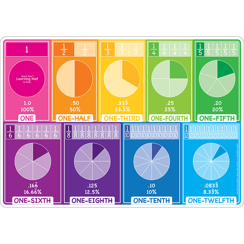 Smart Poly™ material has been designed for the classroom and home. The material is strong, durable, water resistant, and does not need lamination. Practice fractions with this learning mat. Heavy duty double-sided surface for fun and colorful learning on both sides. Write-on/wipe-off surface. Use with dry erase or water based markers and washable crayons. Each side is an interactive lesson. Mat measures 12" x 17".