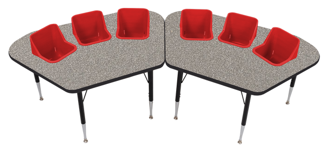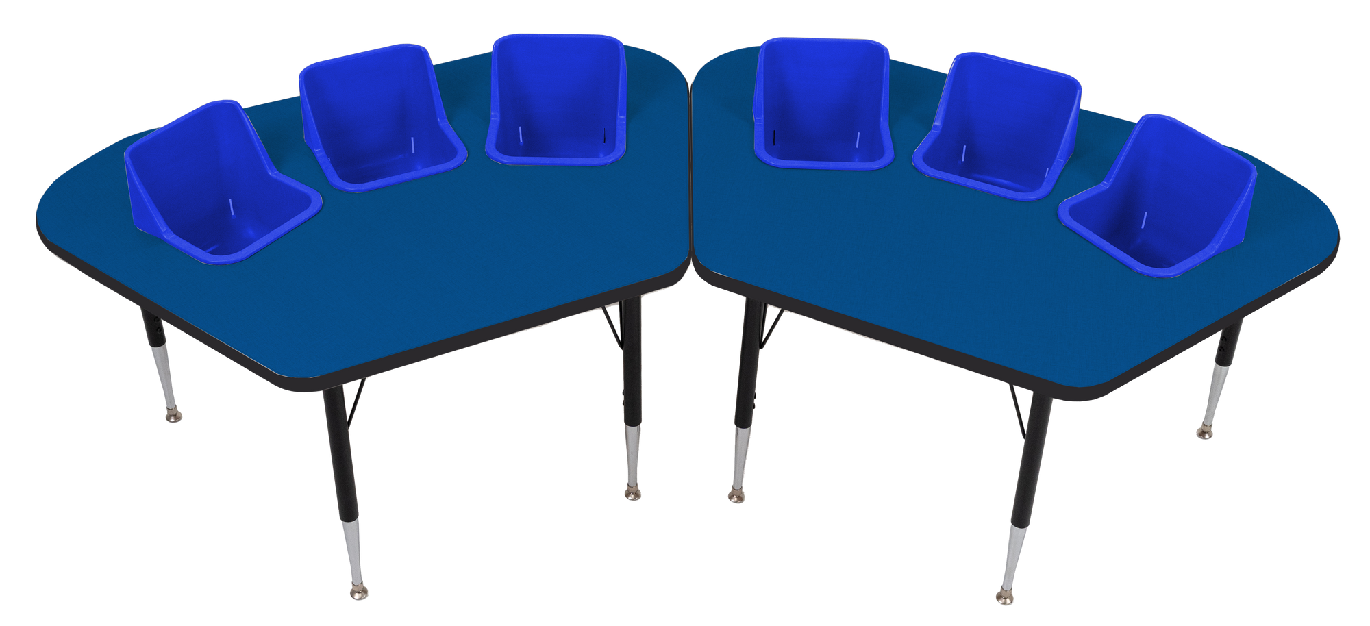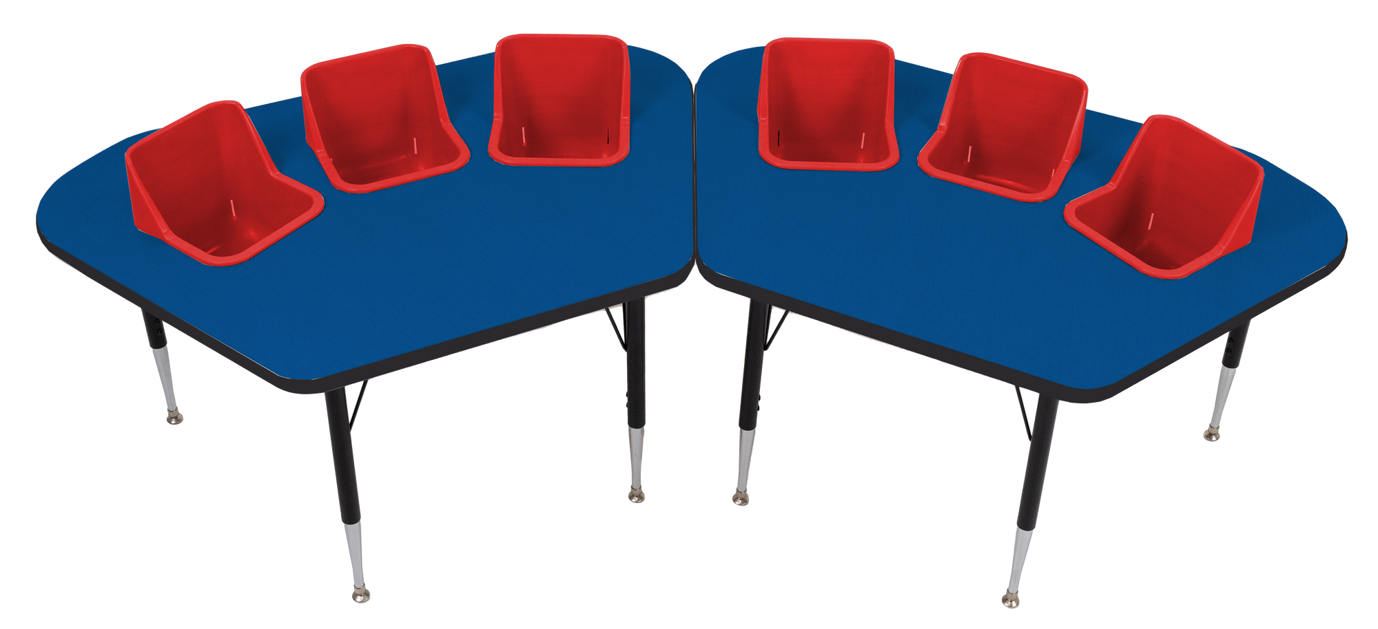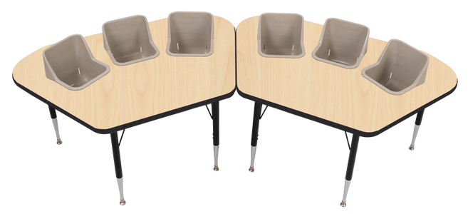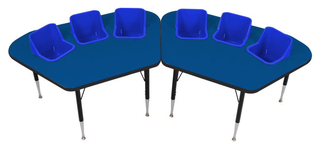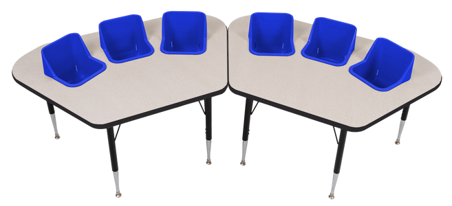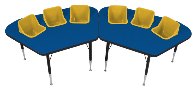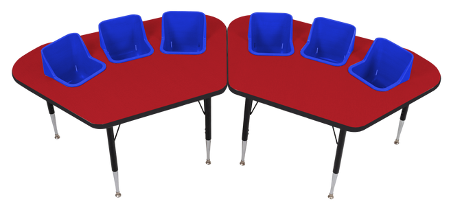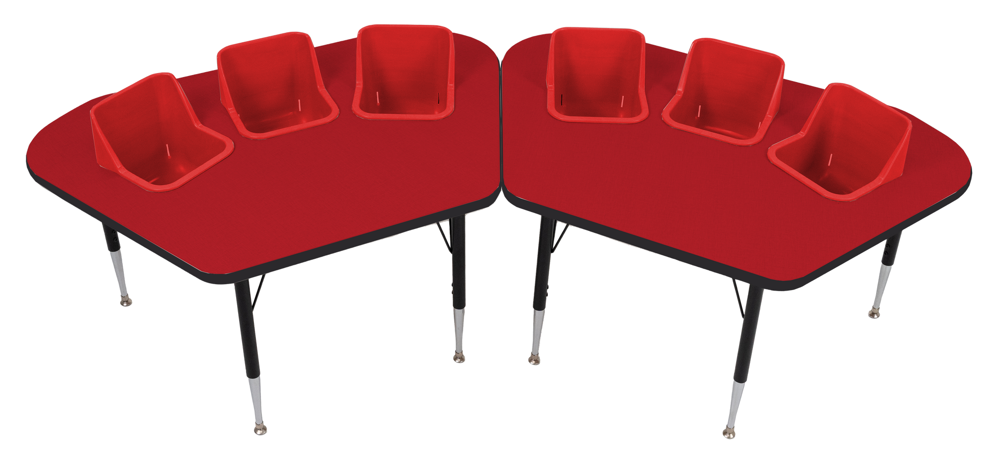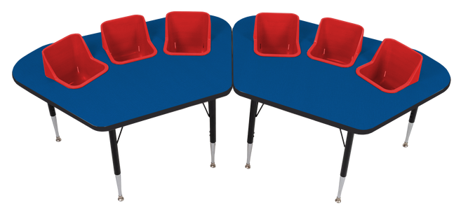 This pair of Toddler Tables 3-seat modular tables will seat 6 children with a single caregiver. Tables have removable seats and are easy to clean. Table tops are 1-1/8'' thick with an easy to clean laminate surface. Safety seat belts are included. For children up to 25 lbs. Seats measure 8-1/2'' Deep x 8-5/8'' Wide. Overall 50” wide x 31” deep. Adjustable height legs.