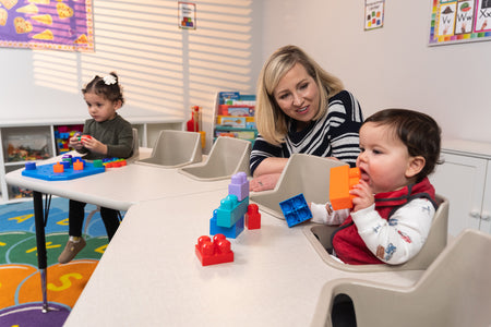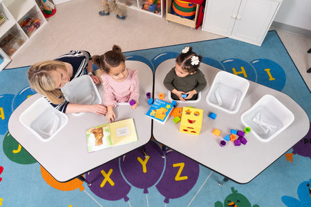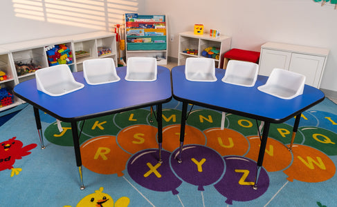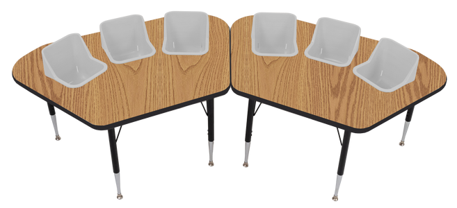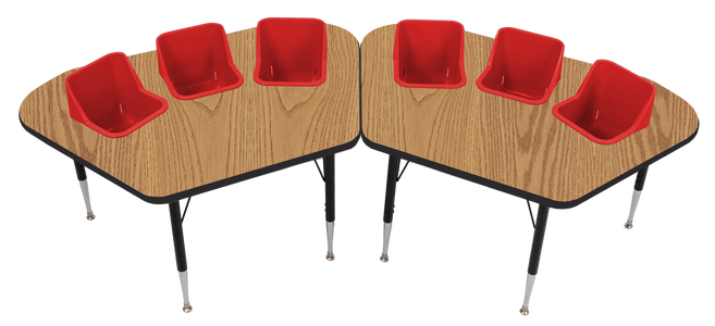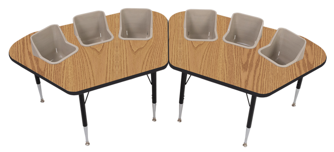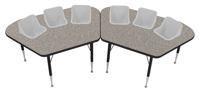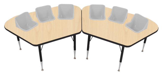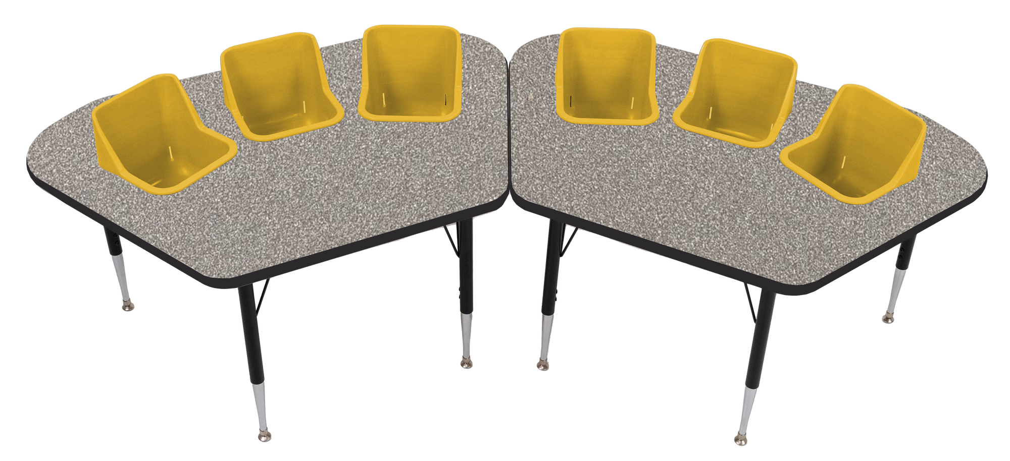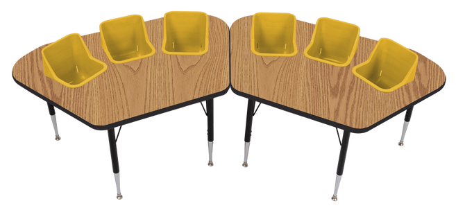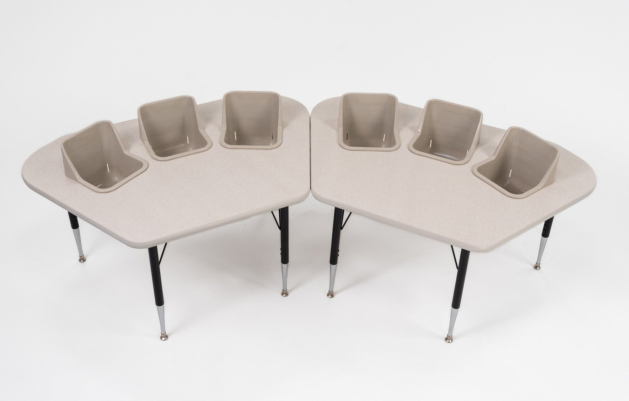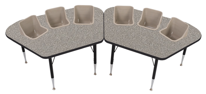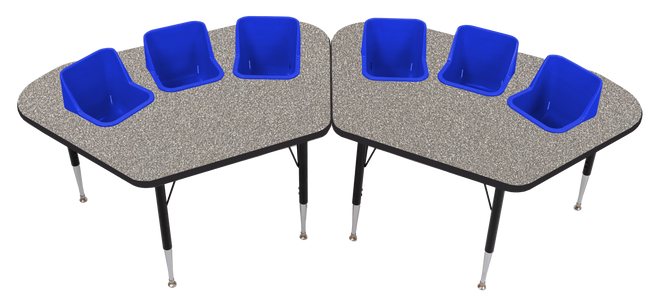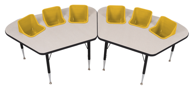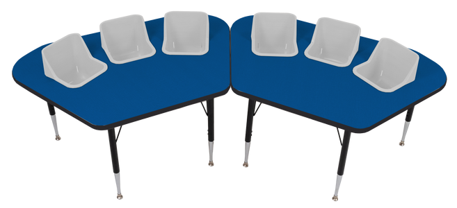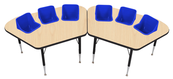 This pair of Toddler Tables 3-seat modular tables will seat 6 children with a single caregiver. Tables have removable seats and are easy to clean. Table tops are 1-1/8'' thick with an easy to clean laminate surface. Safety seat belts are included. For children up to 25 lbs. Seats measure 8-1/2'' Deep x 8-5/8'' Wide. Overall 50” wide x 31” deep. Adjustable height legs.