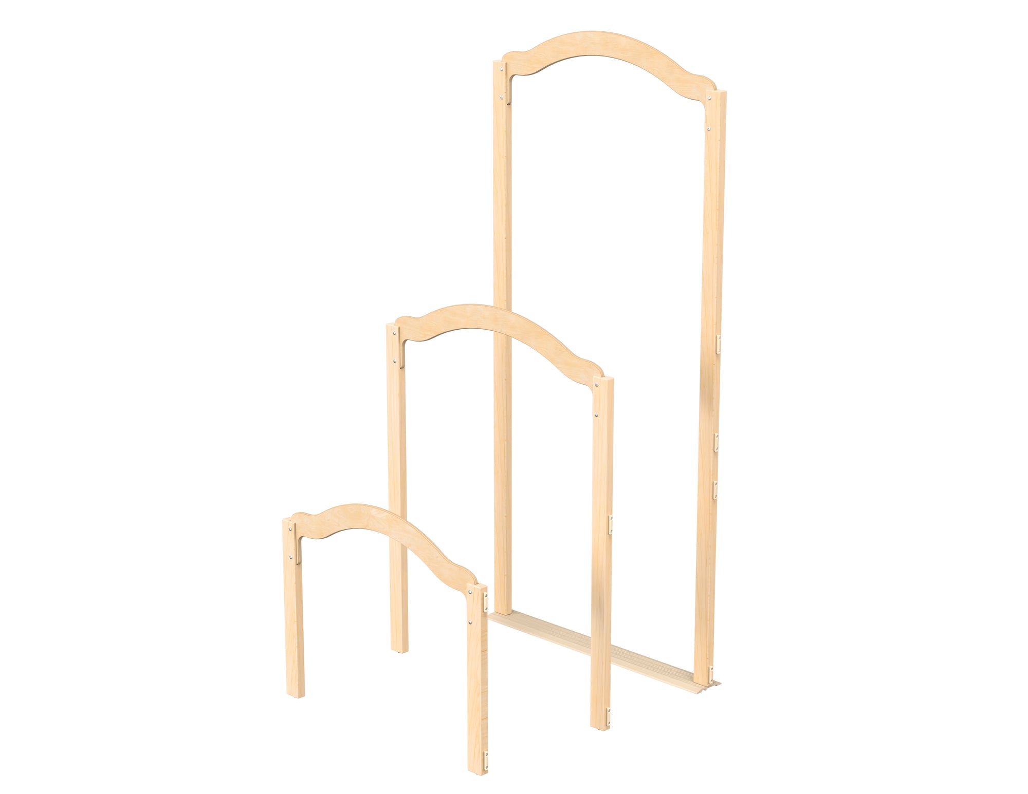 Archway provide a clubhouse feel for young children. 26 1/2" tall and 31" wide opening. No threshold. 34" wide x 1 1/2" deep x 30" high. Connect to T-Height Hubs (24 1/2” high).
