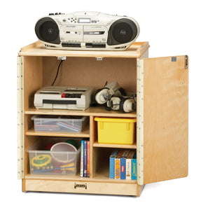 Secure mobile storage for audio/visual equipment, rhythm band instruments, musical supplies or DVDs, CDs or tapes. Grommet in top and two openings in back for cord management. Two adjustable shelves. 24" wide x 20" deep x 30" high.