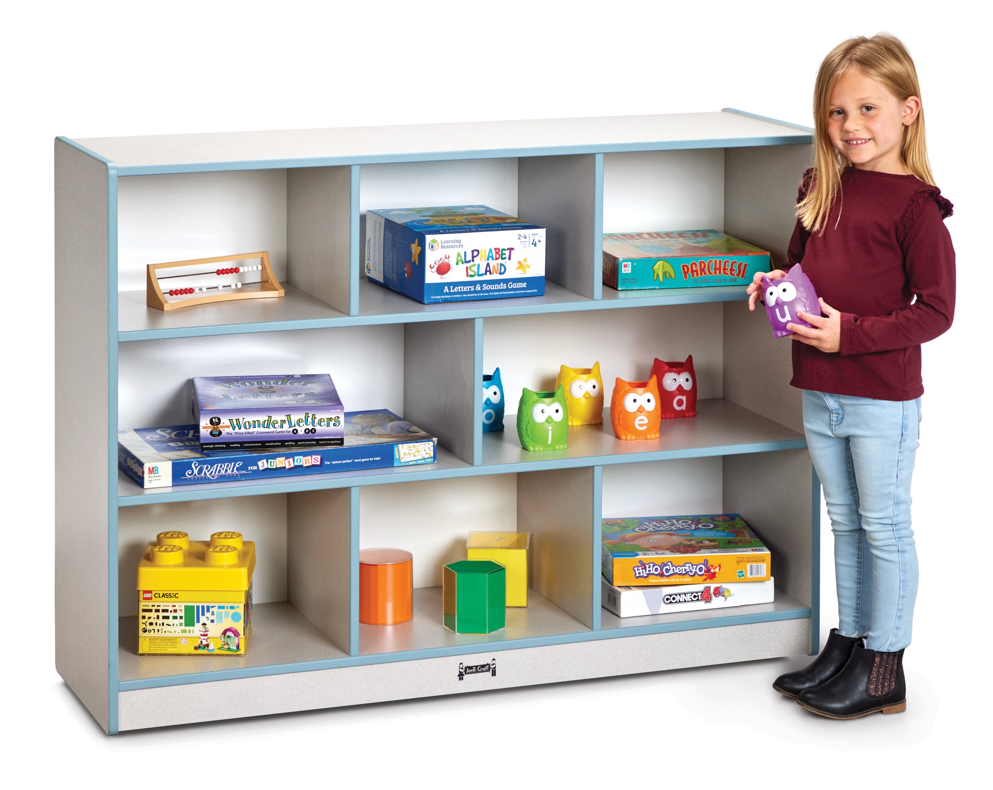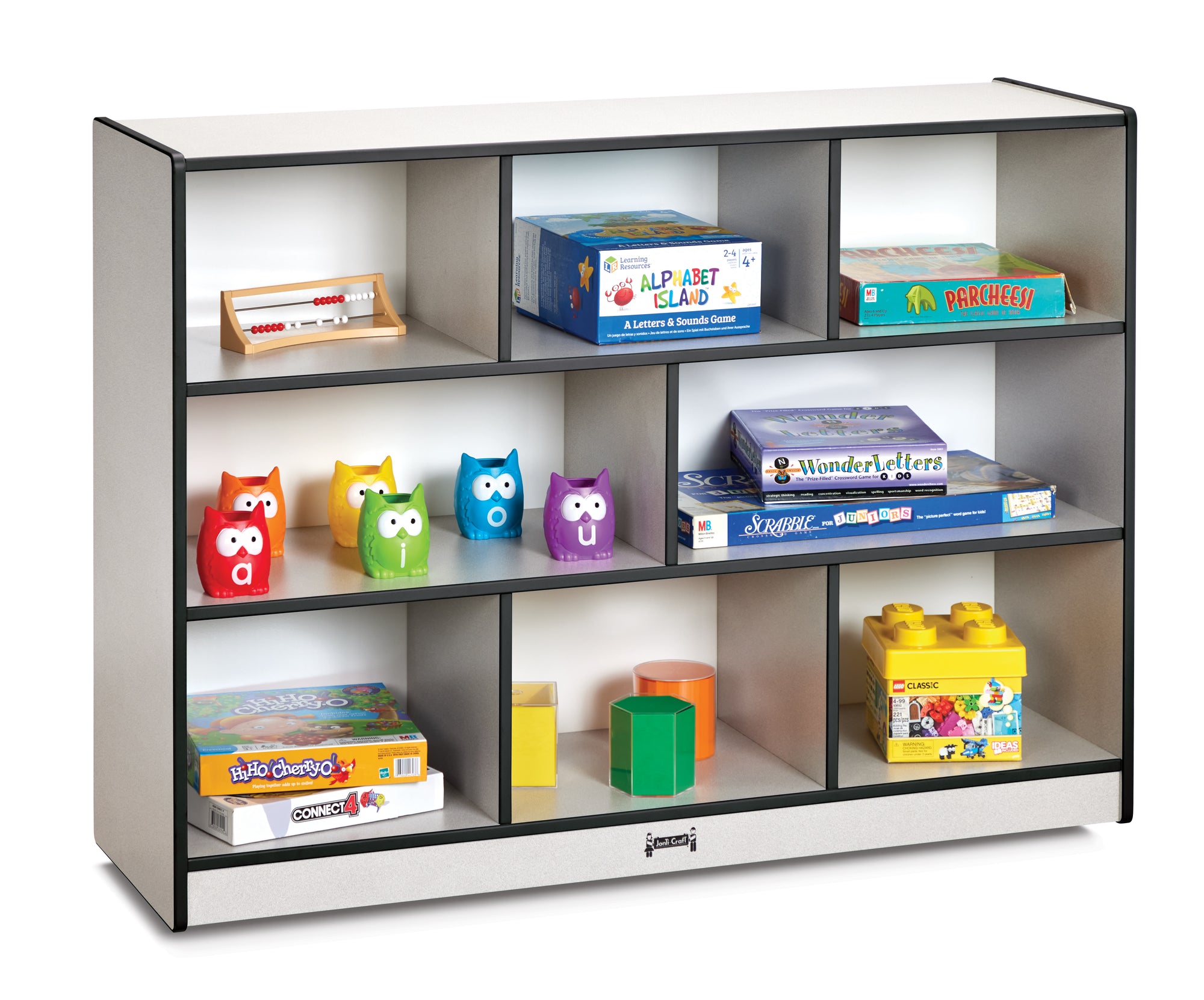 Just the right storage height for all ages! Books, toys, games, and more fit perfectly in these storage units. Units are made with double-sided freckled-gray laminate with colored TRUEdge. 48" Wide x 15" Deep x 35" High.