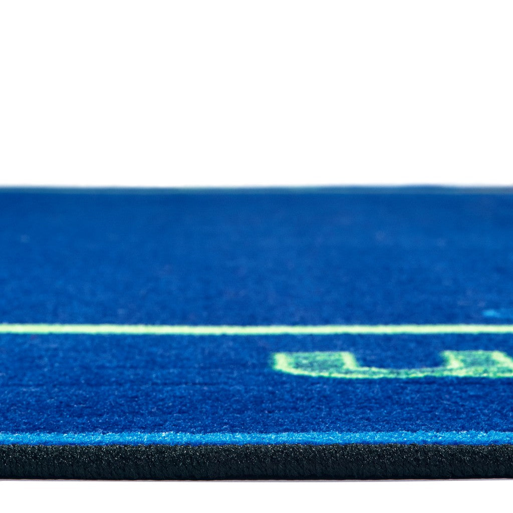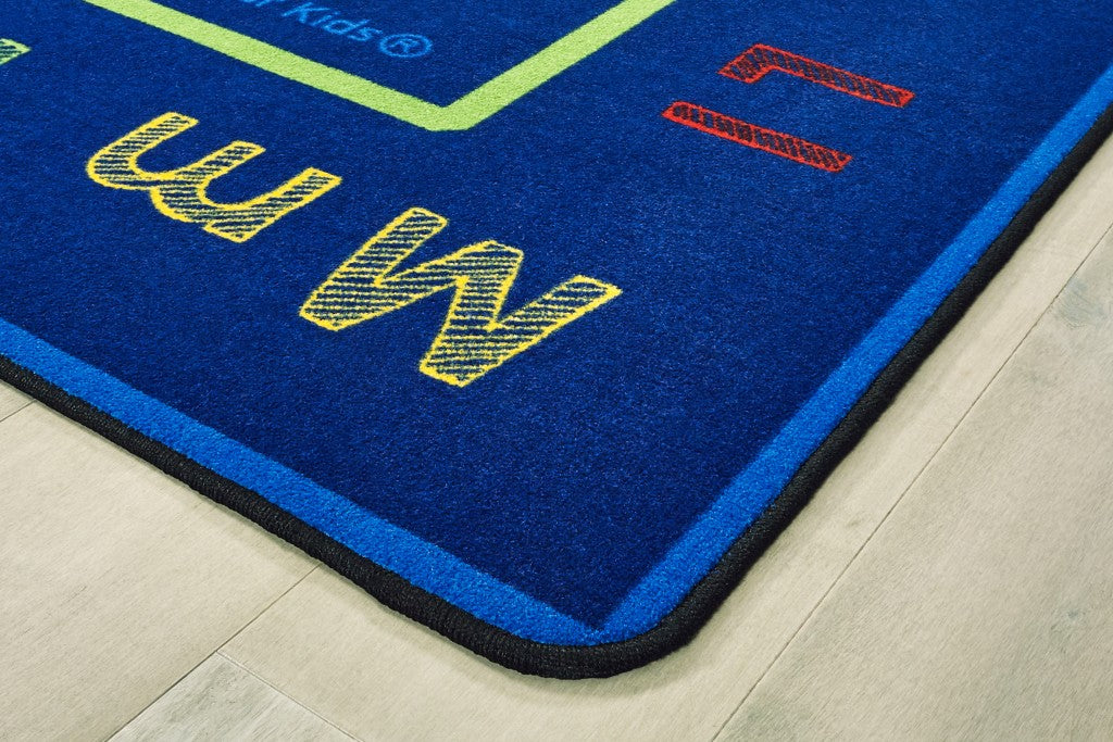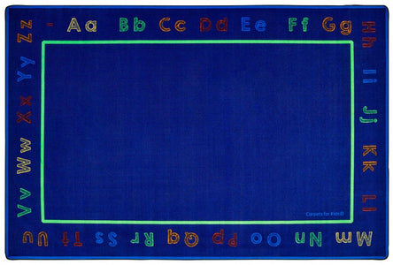 Chalkboard design to coordinate with your chic décor, this premium rug is ideal for classrooms, care centers, and playrooms. Blue background with colorful chalk looking alphabet border.