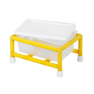 Sand & Water Tables, Each tub is 16"l x 11-1/2"w x 6-3/4"h with its own snap on lid. Easy assembly (no tools required) with anti-slip heavy duty rubber floor protectors. All parts are non-rust snap together ABS plastic. Two heights available (20" and 24"). These can also be used for book storage.