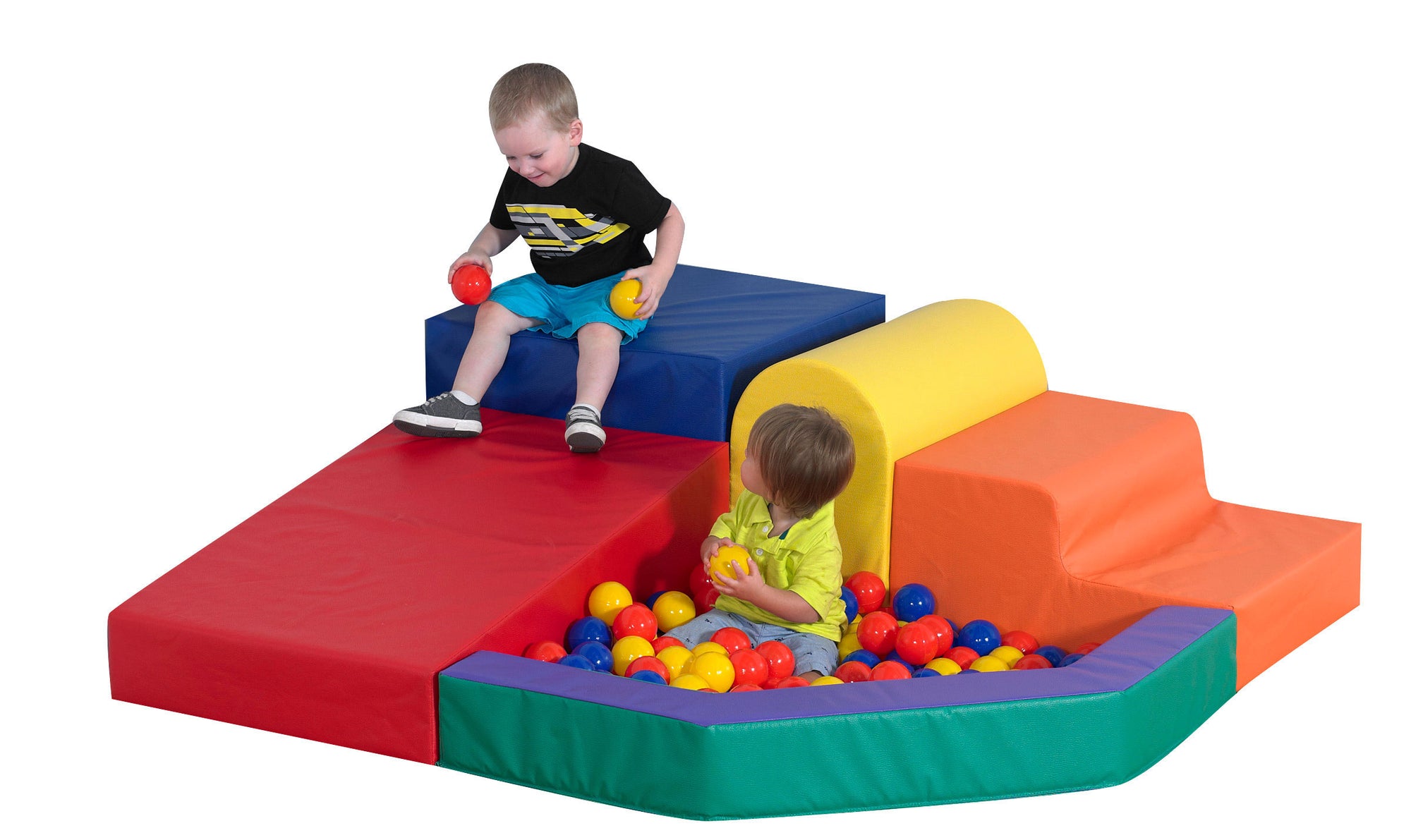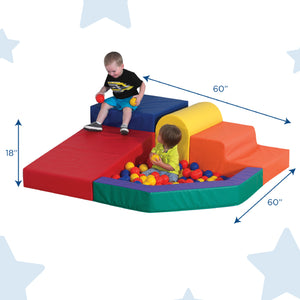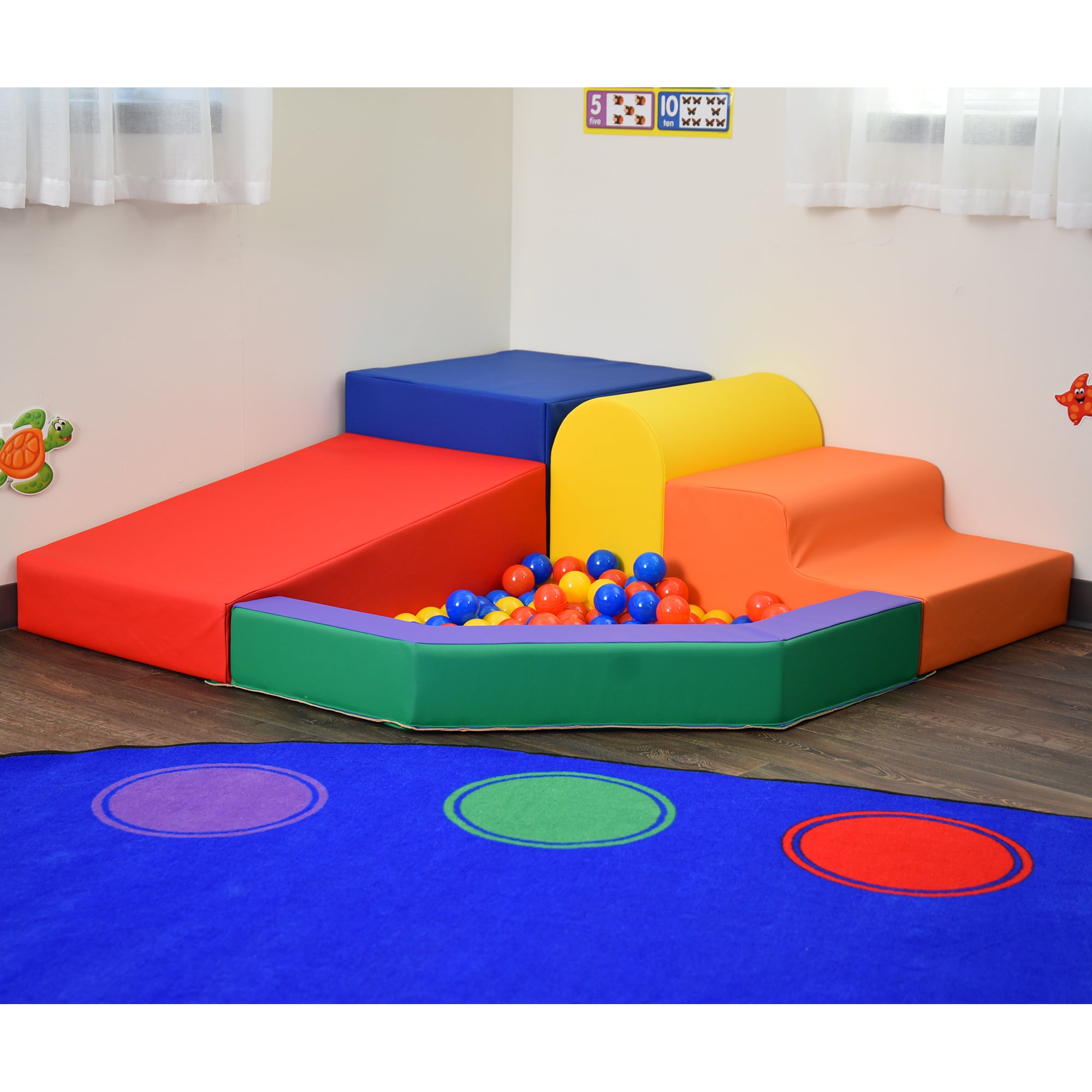 Bright colors attract curious climbing crawlies through 3's to our soft corner climber. Vinyl coated nylon covers encapsulate polyurethane foam that cushions every stumble or fall. Ball pool holds 120 primary polyethylene 2-7/8" dia.. play balls. Individual pieces Velcro together. Add two shatter resistant mirrors to enhance and multiply play possibilities (mirrors sold separately). MUST BE PLACED AGAINST WALLS IN A CORNER FOR SAFE PLAY. 5' SQUARE SPARE REQUIRED.