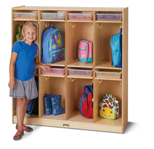 This eight-section locker makes it easy to organize take home items in any space! Each section features a clear Paper-Tray for storing messages, homework, and smaller items. In addition, two double-hooks provide the perfect place for kids to hang book bags, jackets, and more. 50.5" High x 48" Wide 15" Deep