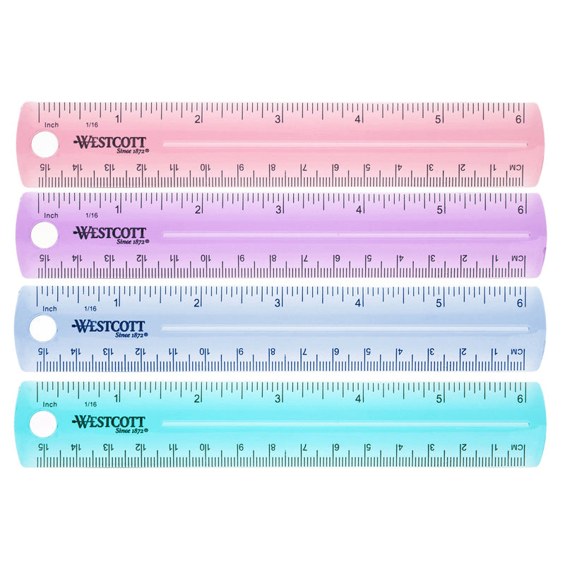 The Westcott 6" Plastic Ruler will brighten your desktop with assorted transparent colors. Ruler measures 6", and includes a hole to hang up. Flexible, durable plastic is perfect for home, office or school use. Features inch and centimeter markings in 1/16" and 1mm increments. Numerals and graduations are sharply delineated. Assorted transparent colors (no color choice).