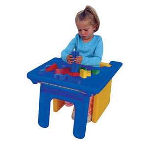 This blue plastic tray rests onto the front of a Cube Chair to provide a play or eating surface close to the child. Legs fold for flat storage.
