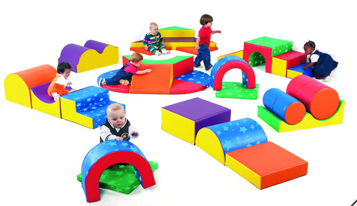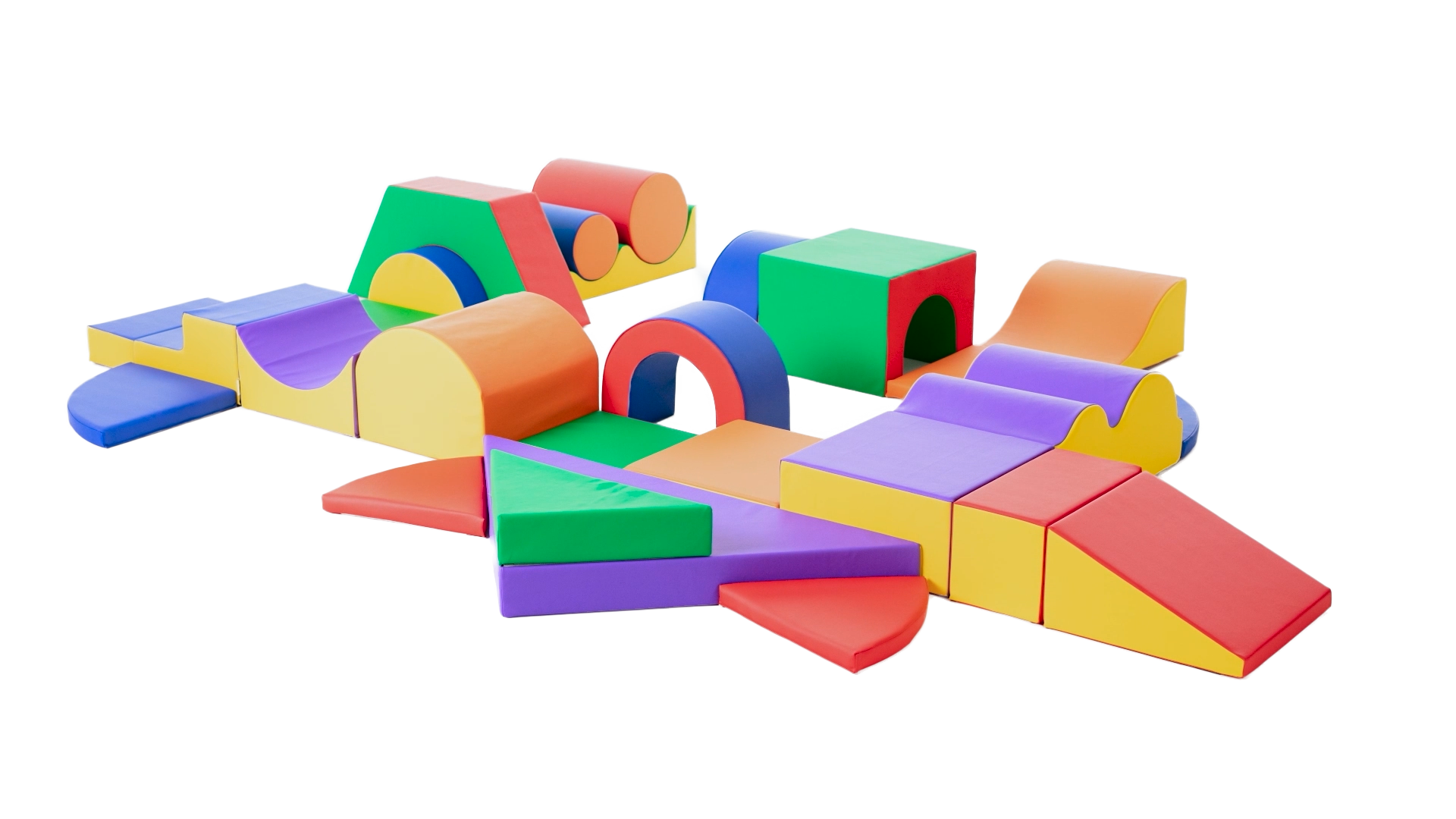 28 formas de juego súper suaves y seguras, diseñadas para gatear hasta más de 2 años. Formas de espuma revestida de Naugahyde® con superficies que encajan en incrementos de 5, 10, 20 y 30 pulgadas. Ofrecen espacio y los pequeños arquitectos desarrollan sus habilidades motoras gruesas. Las formas simples crean infinitas posibilidades de juego.