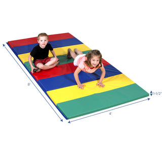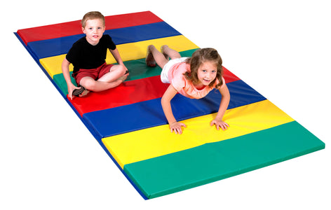Espuma de polietileno multicolor de 3,8 cm especialmente formulada, diseñada para gimnasia exploratoria o juegos de descubrimiento para niños en edad preescolar y niños pequeños. Costuras y dobladillos dobles. Cierres de velcro en ambos extremos para unir las colchonetas y crear bandas de acrobacia. Colchoneta ligera y portátil con paneles cosidos de 30 cm y 60 cm que se pliegan cada 60 cm. Todas las cubiertas de nailon resistente de 380 g recubiertas de vinilo cumplen con las especificaciones de California sobre resistencia al fuego.