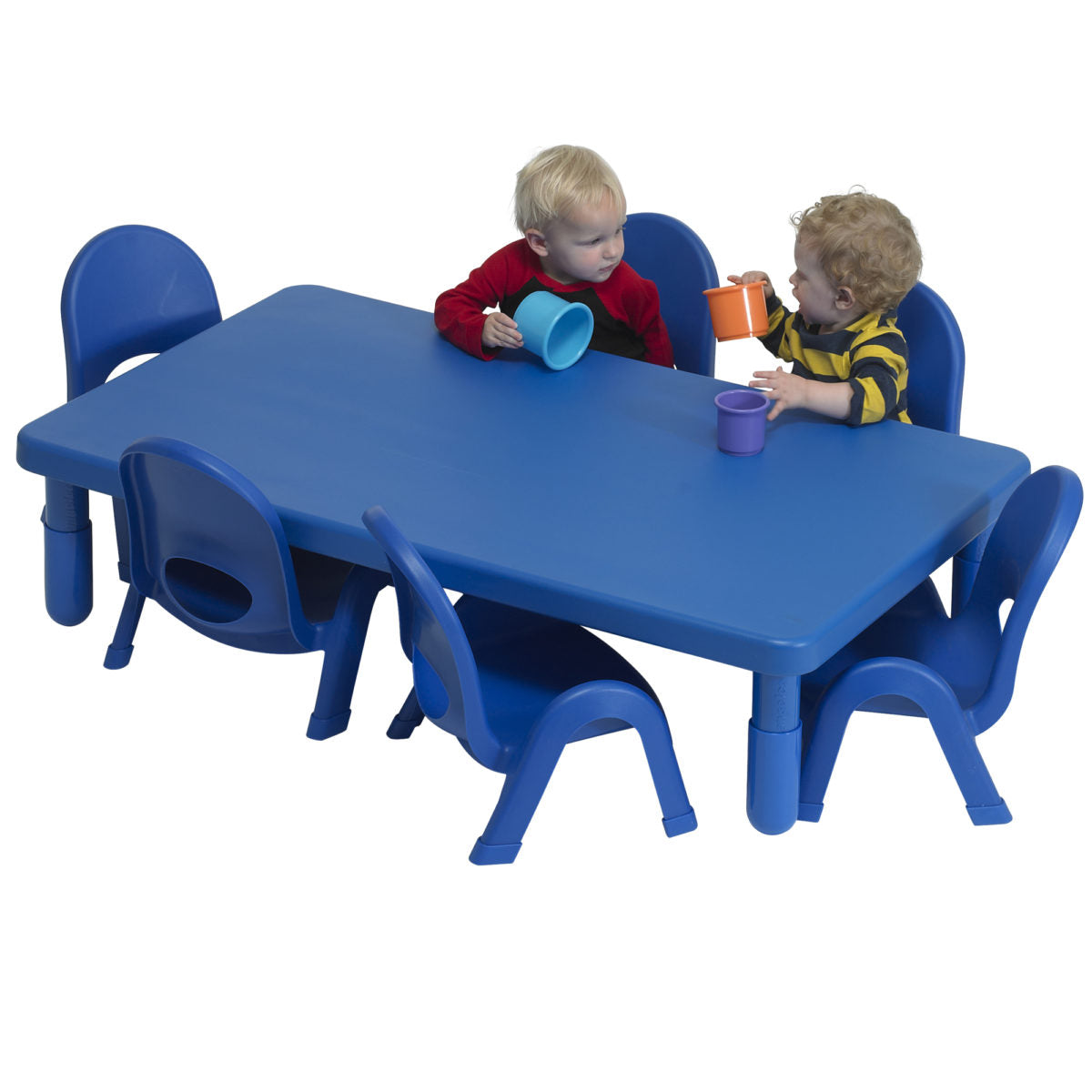 El juego de mesa y sillas MyValue™ para niños pequeños incluye una mesa rectangular de 71 x 122 cm y 30 cm de alto con 6 sillas a juego de 12,7 cm de alto. Las sillas miden 39 cm de largo x 29 cm de ancho x 39 cm de alto. La mesa está diseñada para soportar hasta 18 kg. Las patas se enroscan fácilmente en la mesa sin necesidad de herrajes, lo que facilita el montaje.