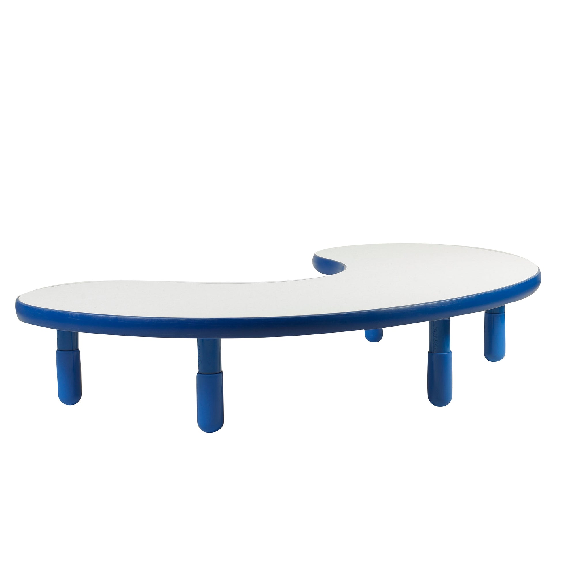 Las mesas BaseLine® son resistentes y duraderas, sin herrajes expuestos y con bordes redondeados. Las fundas protectoras evitan deslizamientos, reducen el ruido y previenen la oxidación. Son fáciles de limpiar gracias a sus superficies laminadas y bordes impermeables. La mesa Kidney tiene un tablero blanco con detalles en azul rey. Las patas de 30 cm se enroscan fácilmente en la mesa sin necesidad de herrajes, lo que facilita el montaje. La mesa mide 165 cm de largo x 96 cm de ancho x 30 cm de alto.