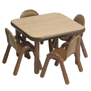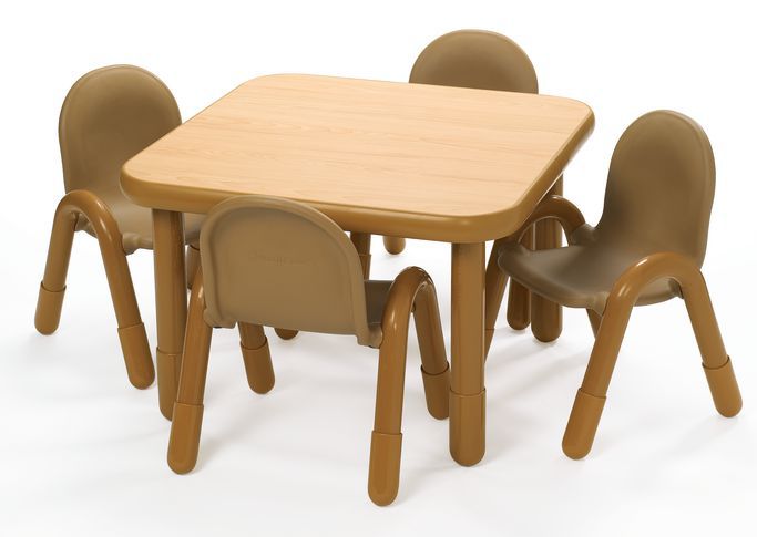 Los juegos de mesa y sillas BaseLine® son duraderos y resistentes, sin herrajes expuestos y con bordes redondeados. Las fundas protectoras evitan deslizamientos, reducen el ruido y previenen la oxidación. Las patas de 50 cm se enroscan fácilmente en la mesa sin necesidad de herrajes, lo que facilita el montaje. Las mesas son fáciles de limpiar gracias a sus superficies laminadas y sus bordes impermeables. El juego de mesa y sillas cuadradas de 76 cm para preescolar incluye una mesa cuadrada de 76 cm y 50 cm de alto con 4 sillas BaseLine® a juego de 28 cm de alto. Las sillas miden 42 cm de largo x 39 cm de ancho x 54 cm de alto. La mesa de madera natural tiene un tablero de fórmica de madera natural con aspecto de madera y borde marrón.