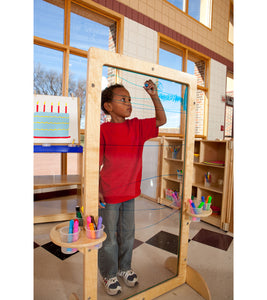 Los niños pueden pintar por ambos lados de este caballete de acrílico transparente. Los portavasos de pintura están montados a ambos lados del marco de abedul. Montaje mínimo. 89 cm de ancho x 127 cm de alto.