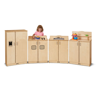 Diseñado específicamente para niños de primaria y programas extraescolares, esta cocina ofrece un juego realista con controles giratorios de madera, máquina de hielo y cuatro quemadores. Los cierres magnéticos mantienen las puertas cerradas, mientras que las manijas y el grifo cromados le dan un toque sofisticado. La encimera mide 72 cm de alto.