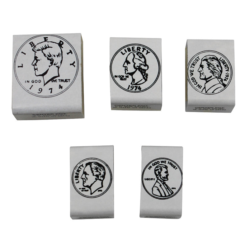 Identificar monedas y resolver problemas de matemáticas con dinero es mucho más fácil con estos 5 sellos de goma realistas de 1, 5, 10, 25 y 50 centavos. Mientras los niños estampan juegos, lecciones y dinero de juguete, practican mucho las matemáticas básicas.