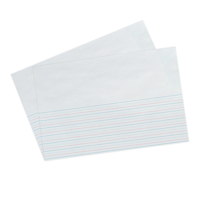 Papel periódico blanco limpio, impreso por ambas caras con un espacio en blanco de 15 cm en la parte superior. Línea base roja, línea central azul discontinua y formato de línea a línea. El tamaño de la hoja es de 45 x 30 cm y el paquete contiene 250 hojas. Reciclable.