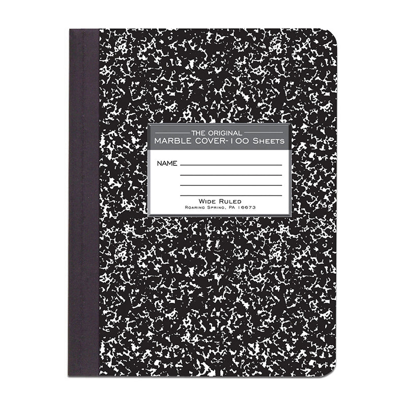 Anota tus notas en este cuaderno de composición con encuadernación permanente. El papel es liso de 15 lb con líneas azules de renglón ancho y margen rojo. Las tapas son de pizarra blanca dura con el tradicional diseño de mármol negro. El interior de las tapas incluye el horario de clases y otra información útil. Cada cuaderno está cosido al centro y encuadernado con cinta adhesiva; no está diseñado para arrancar hojas. El tamaño de las hojas es de 9,75" x 7,5" y cada cuaderno contiene 100 hojas. ¡Hecho con orgullo en EE. UU.!