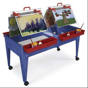 Espacio para 4 pintores en los 2 caballetes de plástico transparente y resistente. Al retirar los caballetes, encontrará un Centro de Actividades de Arena y Agua Double Mite con 2 recipientes de plástico transparente de 23 cm de profundidad. Incluye 4 Super Caddies, 24 clips para caballete y 2 tapas blancas de plástico. 4 ruedas de fácil manejo con bloqueo para una gran movilidad. UPS Ground. 53 cm de ancho x 117 cm de largo x 99 cm de alto. Requiere ensamblaje. Un año de garantía.