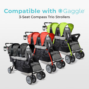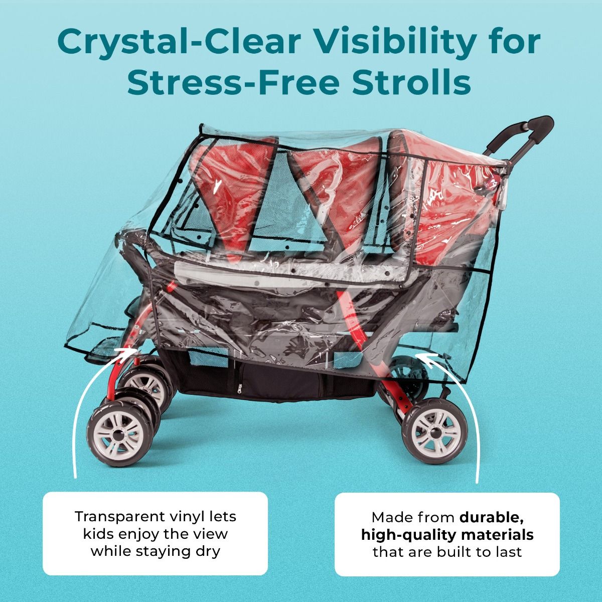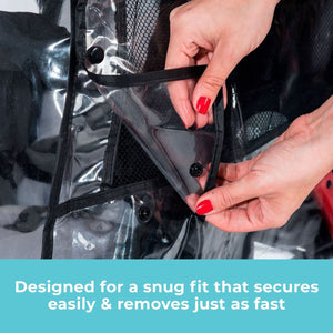 La funda impermeable Gaggle® Trio Sport™ protege a los niños de la lluvia y las inclemencias del tiempo. Su resistente funda de vinilo transparente se ajusta firmemente a la carriola deportiva. Las solapas de 360° se cierran con broches fáciles de usar que rodean la ventana de malla. Las solapas laterales se abren, creando una ventana de malla para la circulación del aire. Los orificios de la funda de vinilo transparente permiten la ventilación cuando la carriola está completamente cubierta.