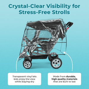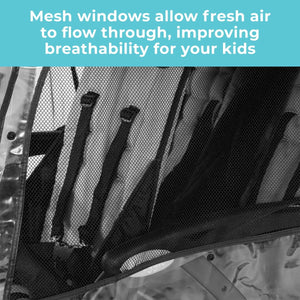La funda impermeable Gaggle® Quad Sport™ protege a los niños de la lluvia y las inclemencias del tiempo. Su resistente funda de vinilo transparente se ajusta firmemente a la carriola deportiva. Las solapas de 360° se cierran con broches fáciles de usar que rodean la ventana de malla. Las solapas laterales se abren, creando una ventana de malla para la circulación del aire. Los orificios de la funda de vinilo transparente permiten la ventilación cuando la carriola está completamente cubierta.