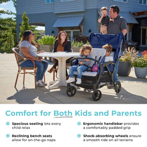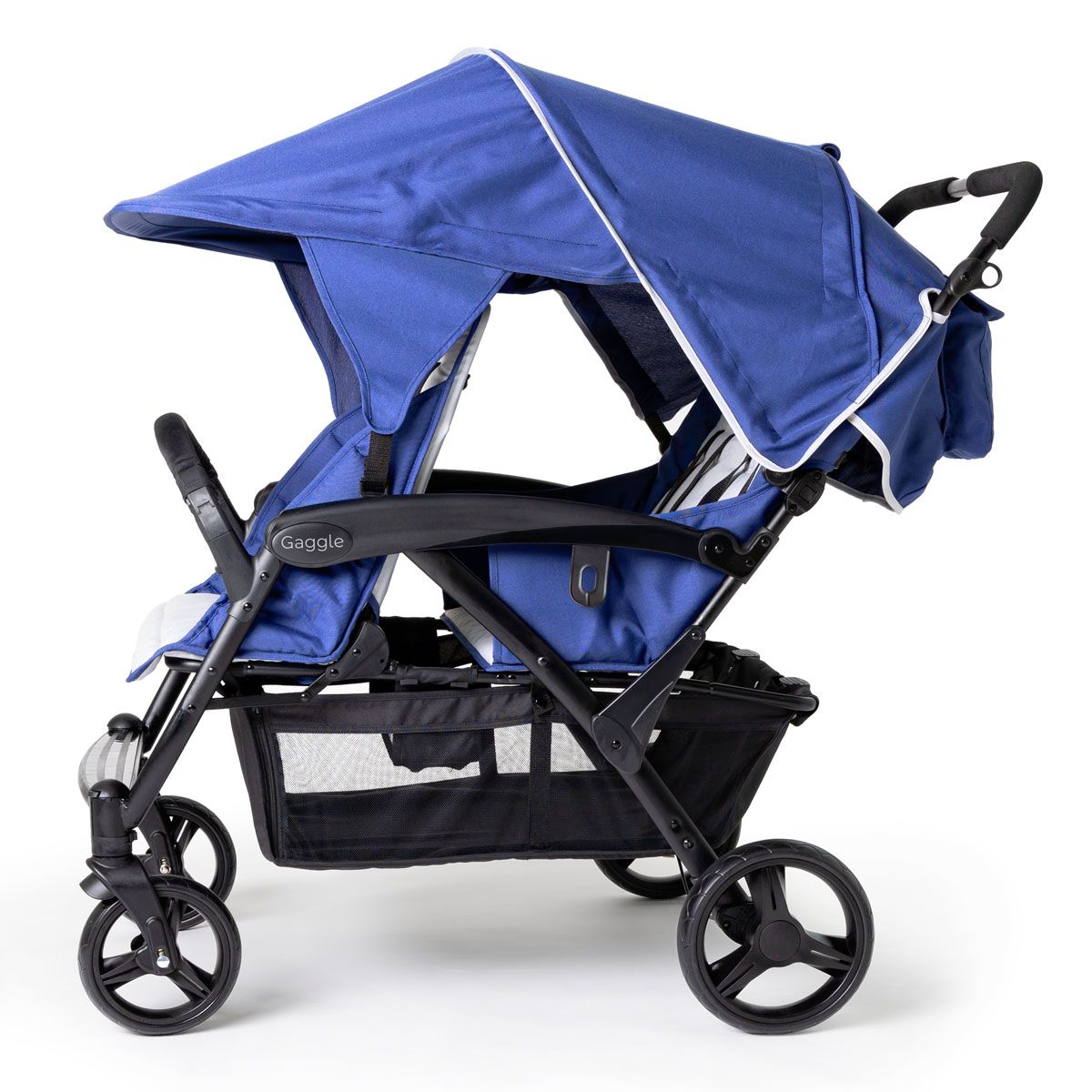La carriola Gaggle Odyssey de 4 plazas cuenta con un diseño único de asiento acolchado y reclinable con numerosas características que ofrecen seguridad, comodidad y facilidad de uso. El espacioso asiento y el reposabrazos giratorio facilitan que los niños pequeños entren y salgan de la carriola por sí solos. El almacenamiento adicional y los portavasos, el armazón ligero y la capota segura ofrecen mayor protección contra el clima y los rayos UV, lo que resulta práctico para padres y cuidadores. Las ruedas de espuma de goma absorben los impactos para un paseo suave. La carriola Odyssey Quad cumple con los requisitos de los parques temáticos de Disney y es apta para niños de 6 meses a 18 kg.