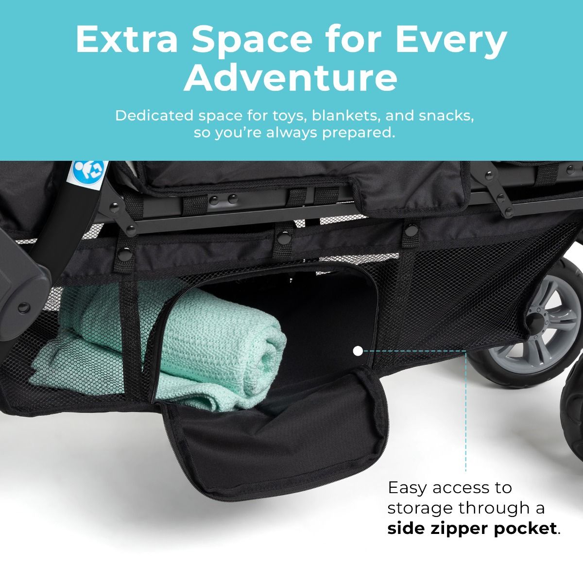 La carriola triple Compass Trio ofrece la comodidad que los niños adoran con la practicidad que los adultos necesitan. Esta carriola multiniño tiene capacidad para tres pasajeros, y cada asiento reclinable cuenta con un arnés de 5 puntos para la seguridad de los niños. Los asientos en línea, estilo estadio, permiten la visibilidad del niño y la interacción con su entorno. Tres capotas independientes con protección UV ofrecen la máxima protección solar, y la cesta de almacenamiento extragrande garantiza que todos los artículos necesarios estén a mano durante el viaje. La carriola triple Gaggle Compass es ligera, fácil de maniobrar y cabe por puertas estándar.