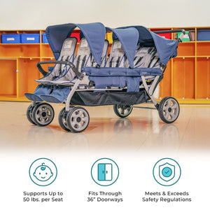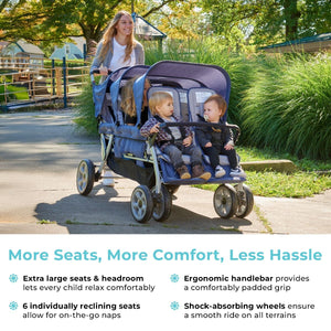 La carriola Gaggle®Jamboree para 6 pasajeros es la carriola multiniños más cómoda, duradera y práctica del mercado. Facilita el transporte de varios niños en su próxima aventura por la calle o el parque. Esta carriola multiniños es esencial para familias numerosas, guarderías, etc., ofreciendo un transporte sencillo para hasta 6 niños a la vez. La suspensión en las cuatro ruedas y el freno de pie de estacionamiento garantizan un control total. Tres capotas con protección UV protegen a los niños mientras viajan en la carriola. Cabe por la mayoría de las puertas estándar, lo que facilita su entrada y salida del aula. Su amplio asiento y altura libre permiten acomodar a niños de hasta 23 kg. Se pliega rápida y fácilmente para guardarlo.