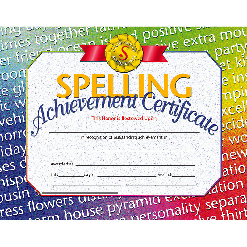 Nuestros diplomas, certificados y premios tienen un tamaño de 21,6 x 28 cm, con hermosos y auténticos diseños impresos a todo color en papel de alta calidad. Se venden en lotes de 36. ¡Ordénelos ahora para que no se decepcione! El certificado dice: Certificado de Logro en Ortografía. Este honor se otorga a _________ en reconocimiento a su destacado logro en _______. Otorgado en ______ este ______ día de ______ año de ______.