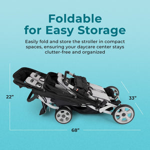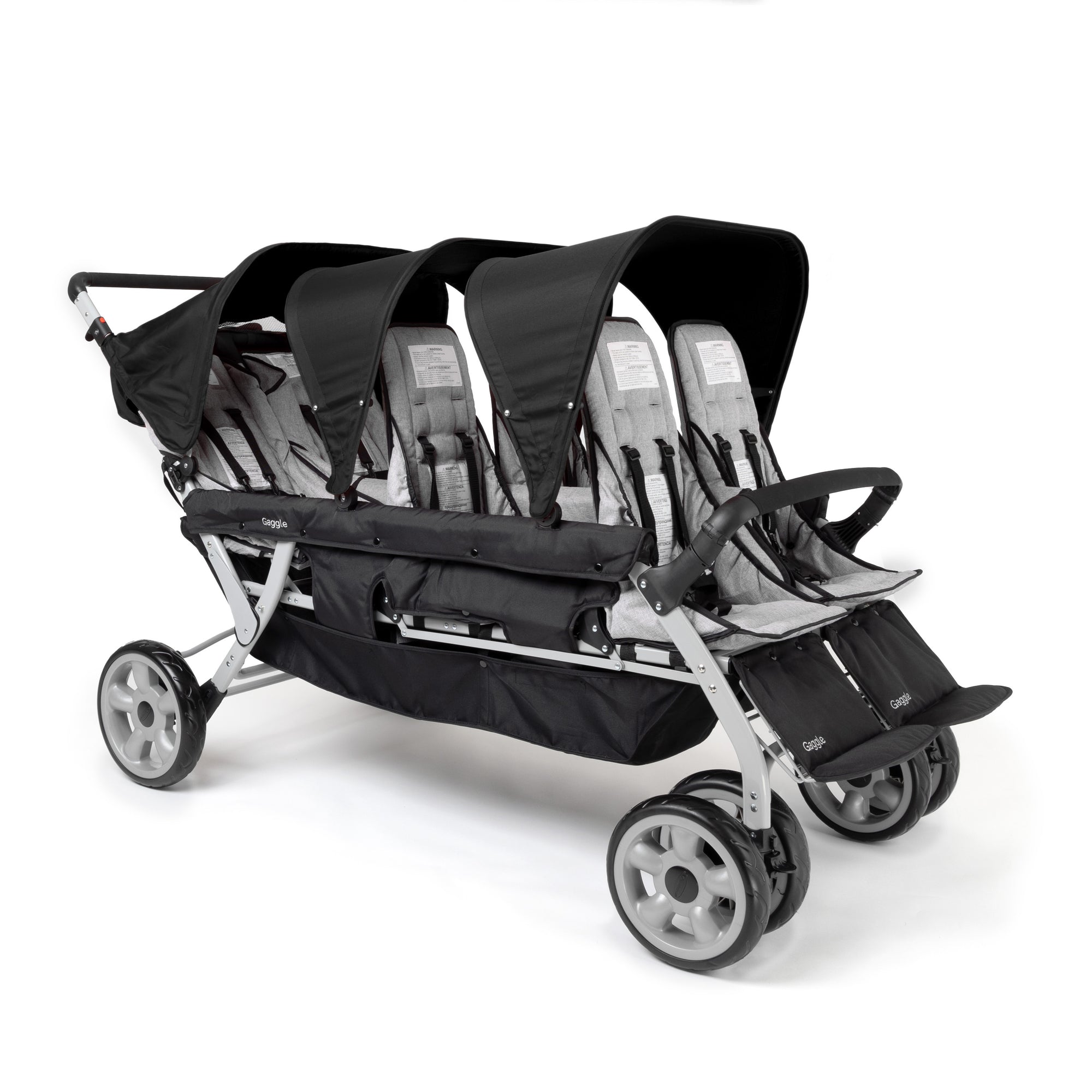 La carriola Gaggle®Jamboree para 6 pasajeros es la carriola multiniños más cómoda, duradera y práctica del mercado. Facilita el transporte de varios niños en su próxima aventura por la calle o el parque. Esta carriola multiniños es esencial para familias numerosas, guarderías, etc., ofreciendo un transporte sencillo para hasta 6 niños a la vez. La suspensión en las cuatro ruedas y el freno de pie de estacionamiento garantizan un control total. Tres capotas con protección UV protegen a los niños mientras viajan en la carriola. Cabe por la mayoría de las puertas estándar, lo que facilita su entrada y salida del aula. Su amplio asiento y altura libre permiten acomodar a niños de hasta 23 kg. Se pliega rápida y fácilmente para guardarlo.