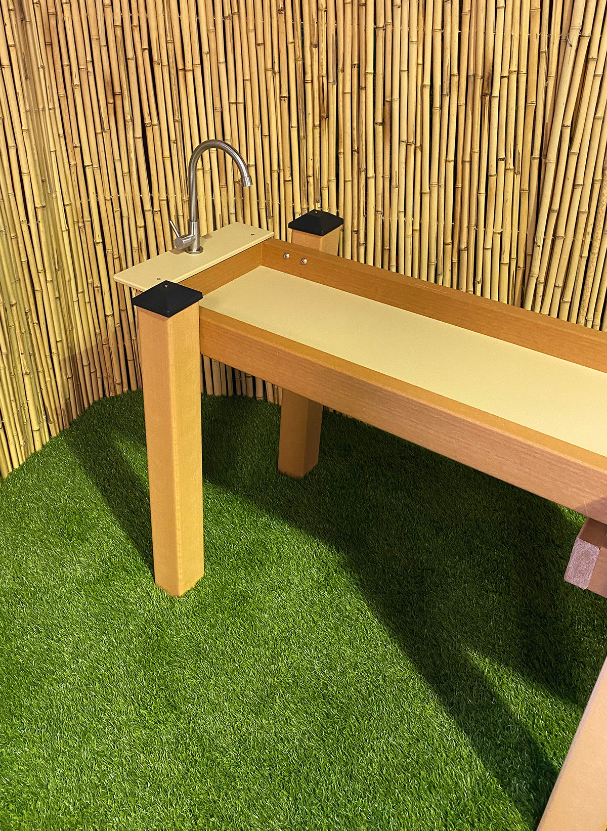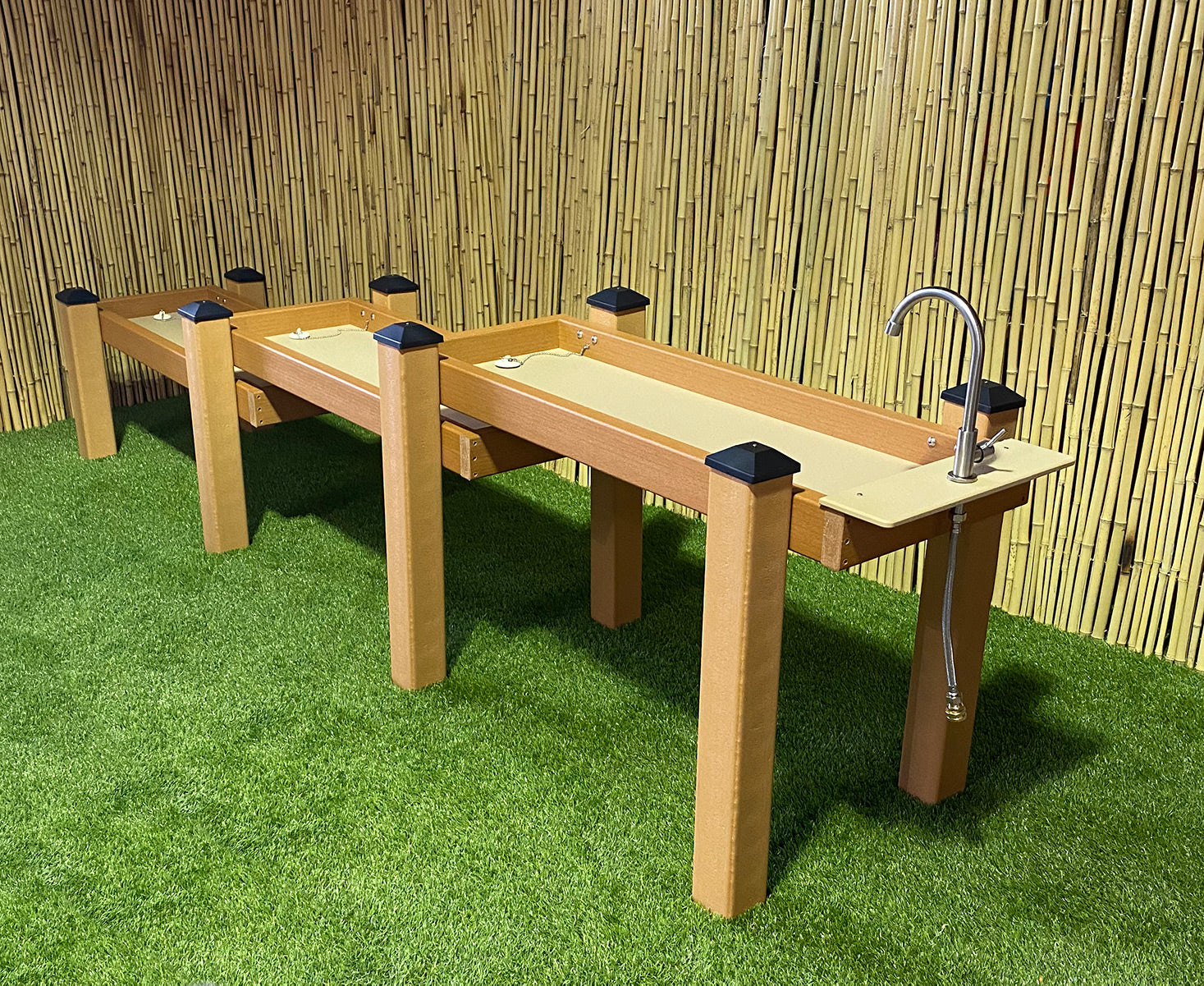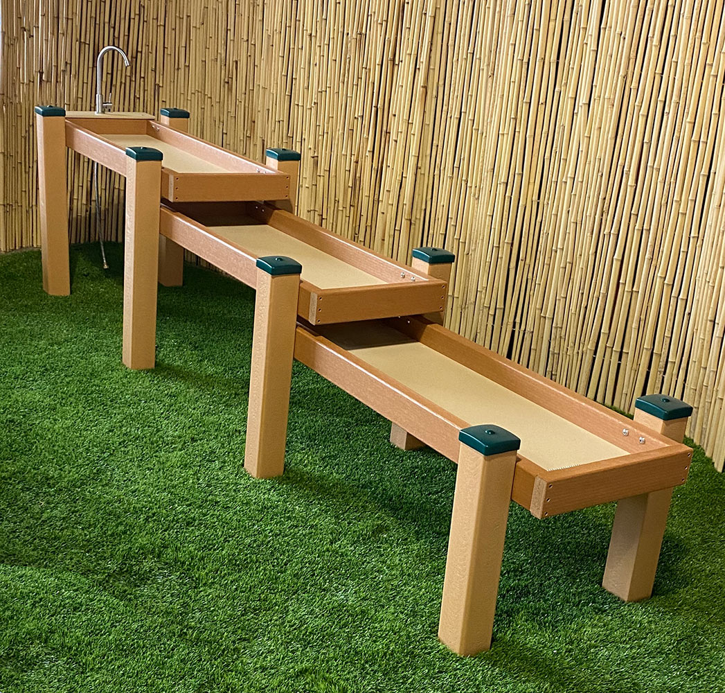 El tamaño de la unidad de triple canal es de 11' 3” x 24” de ancho. Incluye un grifo de acero inoxidable para conectar la manguera de jardín. Incluye placa de montaje. Los componentes están hechos de materiales a base de plástico HDPE reciclado especialmente formulados que no se decoloran, agrietan, pelan ni astillan. Las superficies fáciles de limpiar nunca requieren pintura ni sellado. La pintura, la tinta y otras sustancias no penetrarán el plástico, lo que evita las manchas permanentes. ¡Simplemente límpielo con cualquier limpiador estándar o lavado a presión para una apariencia brillante y nítida durante muchos años! Se utilizan sujetadores de acero inoxidable a prueba de óxido para asegurar una larga vida útil y mantener una apariencia hermosa. Los colores naturales utilizados en los productos Kids' Station Outdoor agregarán en lugar de restar a la apariencia natural de su entorno de juegos.