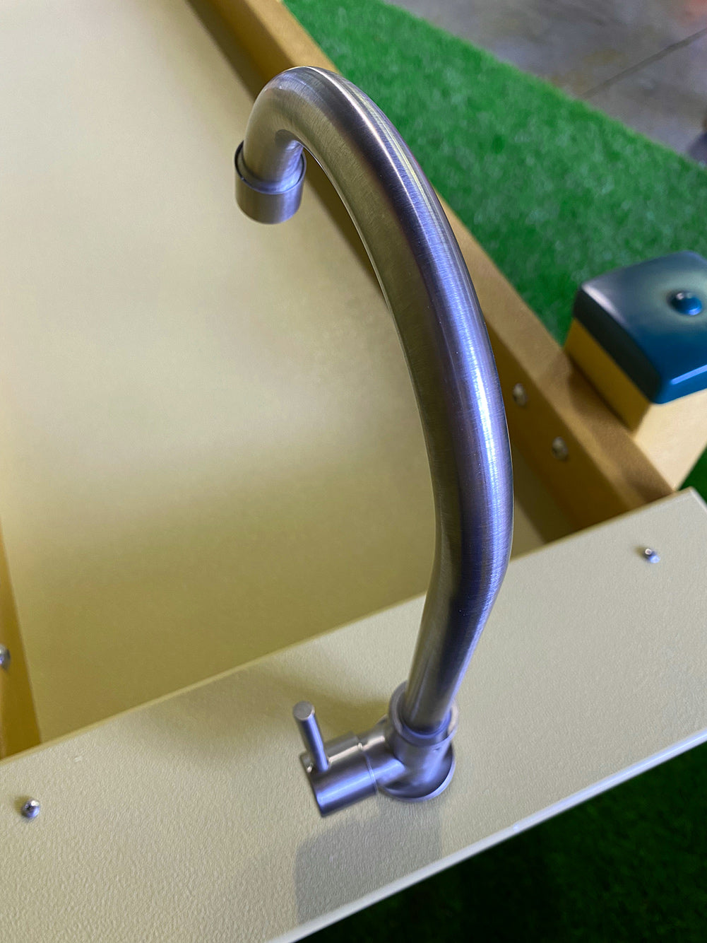 Incluye placa de montaje para conectarlo a un bebedero exterior Kids' Station. Este grifo se conecta a una manguera de jardín para un flujo de agua continuo. Cuenta con una palanca de encendido/apagado para que puedas cerrar el grifo. El grifo es de acero inoxidable para resistir las inclemencias del tiempo.