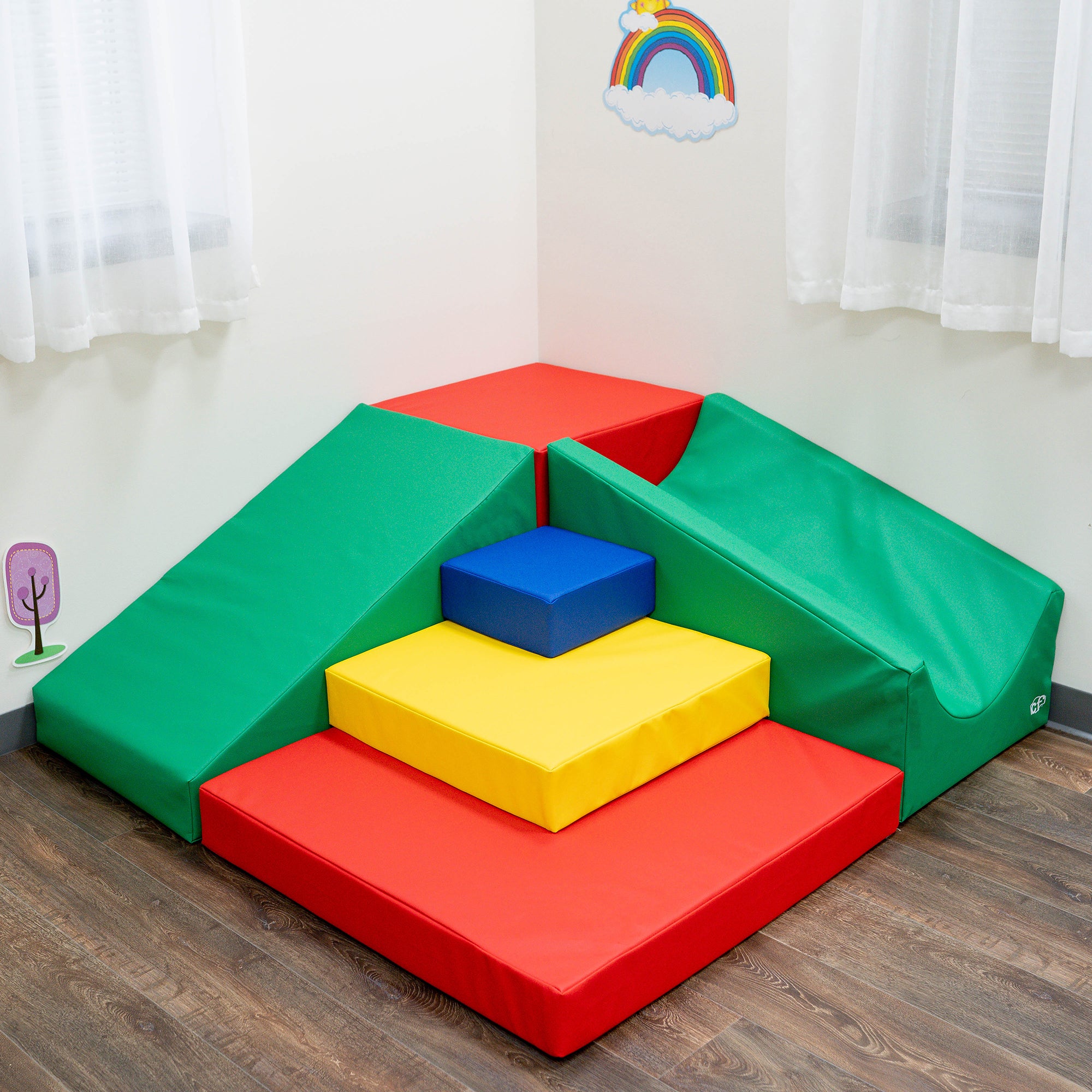 Dos rampas de 7,6 cm a 56 cm de alto duplican la diversión de escalar. Una rampa tiene una forma redonda esculpida para mejorar el aprendizaje de la motricidad gruesa. Ideal para niños de 24 meses a 4 años. Se requiere un espacio de 5 esquinas cuadradas para mayor seguridad.