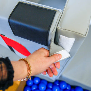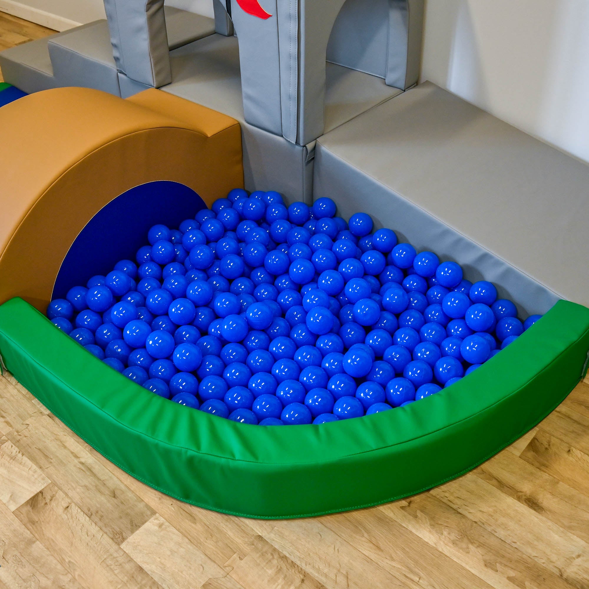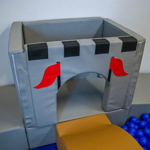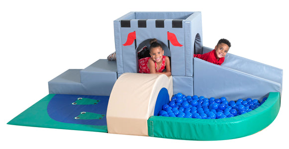 La emoción es máxima mientras los niños de 1 a 3 años suben las escaleras para defender su castillo. Los pequeños caballeros pueden continuar explorando este reino bajando por la rampa de 91 cm de largo x 58 cm de ancho con lados redondeados, o subir por el puente de espuma densa y sólida de 45 cm de alto hasta el foso. Busquen a los dos caimanes que acechan en la alfombra del foso de 114 cm x 91 cm x 2,5 cm de grosor. Frente al foso hay un refugio para pelotas de 104 cm x 78 cm con capacidad para 60 pelotas. ESTE ESCALADOR DEBE COLOCARSE CONTRA UNA PARED PARA UN JUEGO SEGURO. Espacio necesario: 274 cm de largo.