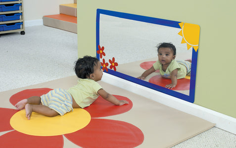 Los niños pequeños se fascinarán explorando su reflejo. Los gráficos están serigrafiados en la parte posterior del espejo para que el color no se raye. El espejo se puede colocar tanto vertical como horizontalmente. 45 cm de ancho x 91 cm de largo. No incluye herrajes.