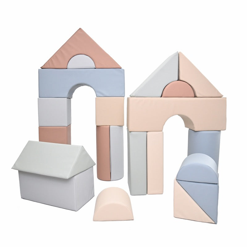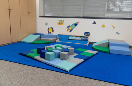 ¡Este versátil tapete de patchwork es cómodo y divertido! Su grosor de 2,5 cm presenta cuadrados en 5 colores contemporáneos diferentes y su funda es de material lavable. Los bloques suaves tienen el tamaño perfecto para que las manitas los carguen, los lancen y los apilen.