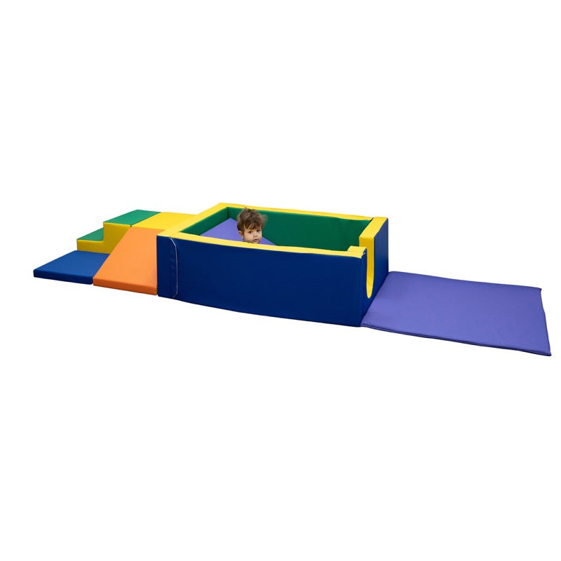 ¡Los pequeños disfrutarán paseando y jugando en nuestro Centro de Aventuras! La alfombra morada de actividades es un lugar tranquilo para comenzar el recorrido o simplemente para terminar de jugar. Después, pase fácilmente al colorido patio de juegos usando la pared de paso. El patio de juegos tiene una alfombra suave de color que amortigua las rodillas y los codos de los pequeños. Salga del patio de juegos subiendo por la rampa hasta la parte superior del trepador de esquina. El Centro de Aventuras incluye 3 secciones suaves: trepador, patio de juegos y alfombra. Todas las piezas se unen con cierres de velcro y están cubiertas de cuero vegano lavable. DEBE COLOCARSE CONTRA UNA PARED PARA UN USO SEGURO.