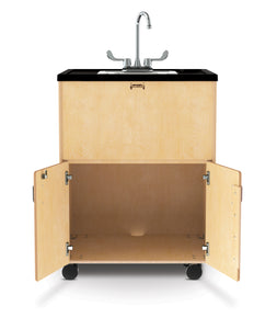 Set up a hand washing station quickly by connecting this portable sink to building plumbing. The sink is perfect for temporary needs; although it can also be used as a permanent fixture if casters are removed and the item is installed per local plumbing and building codes. The 38" counter height (35” without casters) is perfect for adults or older children with the help of a Step-Up Stool. The cabinet is crafted of solid Baltic Birch plywood and features an ABS plastic countertop with 5” deep stainless steel sink. The faucet features a water-saving .5gpm aerator, a tall gooseneck spout, and ADA-complaint paddle handles. Water lines need to be connected to a water source with female 1/2" IPS threaded fittings and drain line needs to be connected with a 1-1/2" slip fitting. * SINK CONTAINS NO INTERNAL PLUMBING, PUMP, OR WATER HEATER.