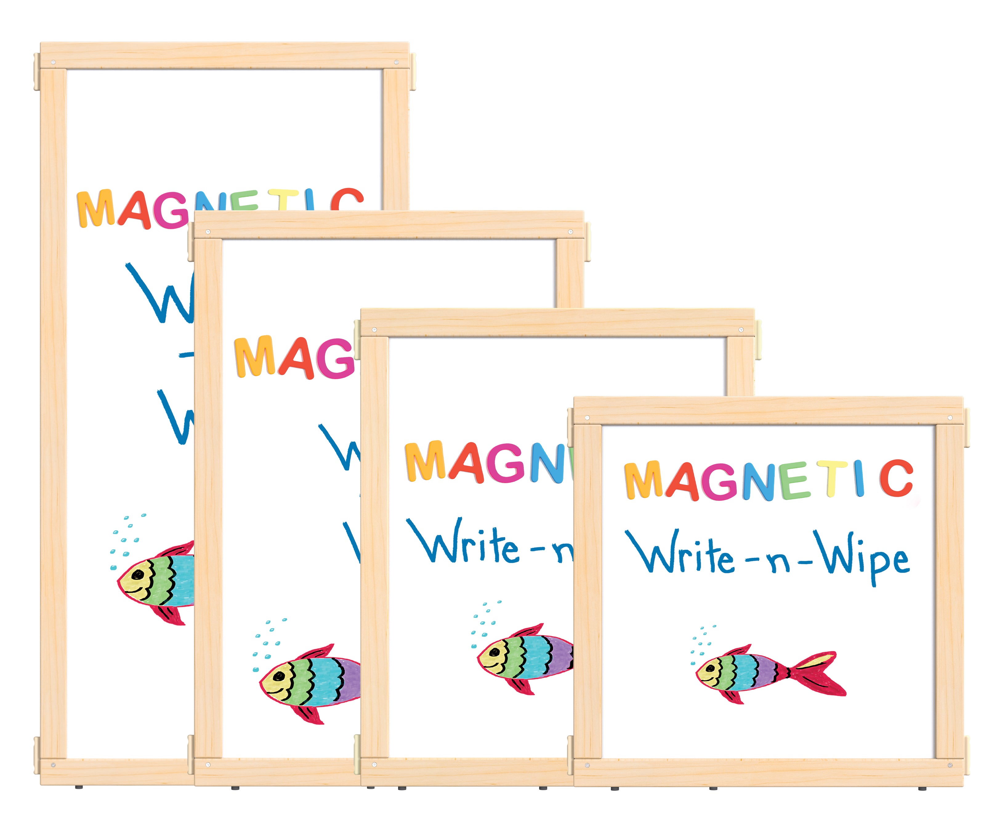 Magnetic Write-n-Wipe Panels help create or define a space and will convert any unit into a language enrichment center. Magnetic Write-n-Wipe surface provides tactile learning and helps improve fine motor skills. One-side Magnetic Write-n-Wipe, other side finished hardboard. Connect to S-Height Hubs (48.5" high).